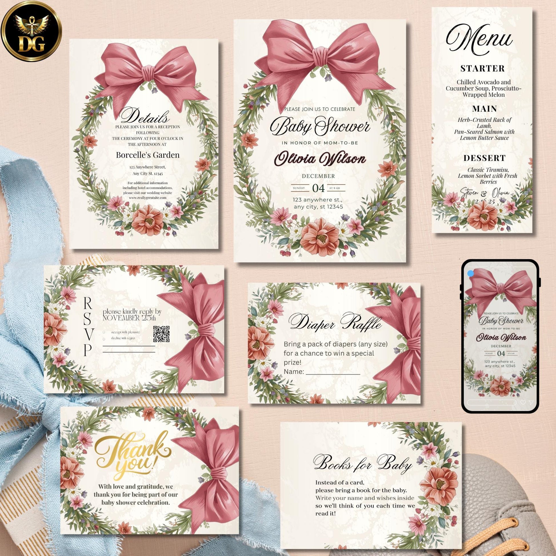 Baby Shower Invitation Pink Velvet Bow Floral Wreath Cream Gold Luxe Bundle Printable + Digital Canva Template