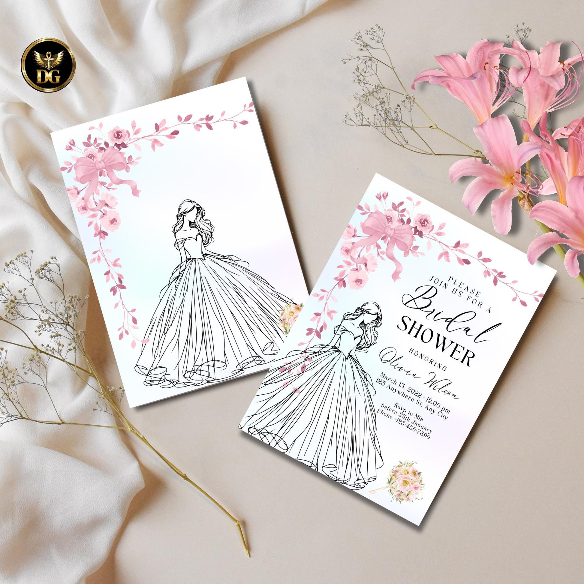 Bridal Shower Invitation Set | Bride Dress with Pink Floral Bow | Pastel Elegant Wedding Shower Invite | Editable Digital Download