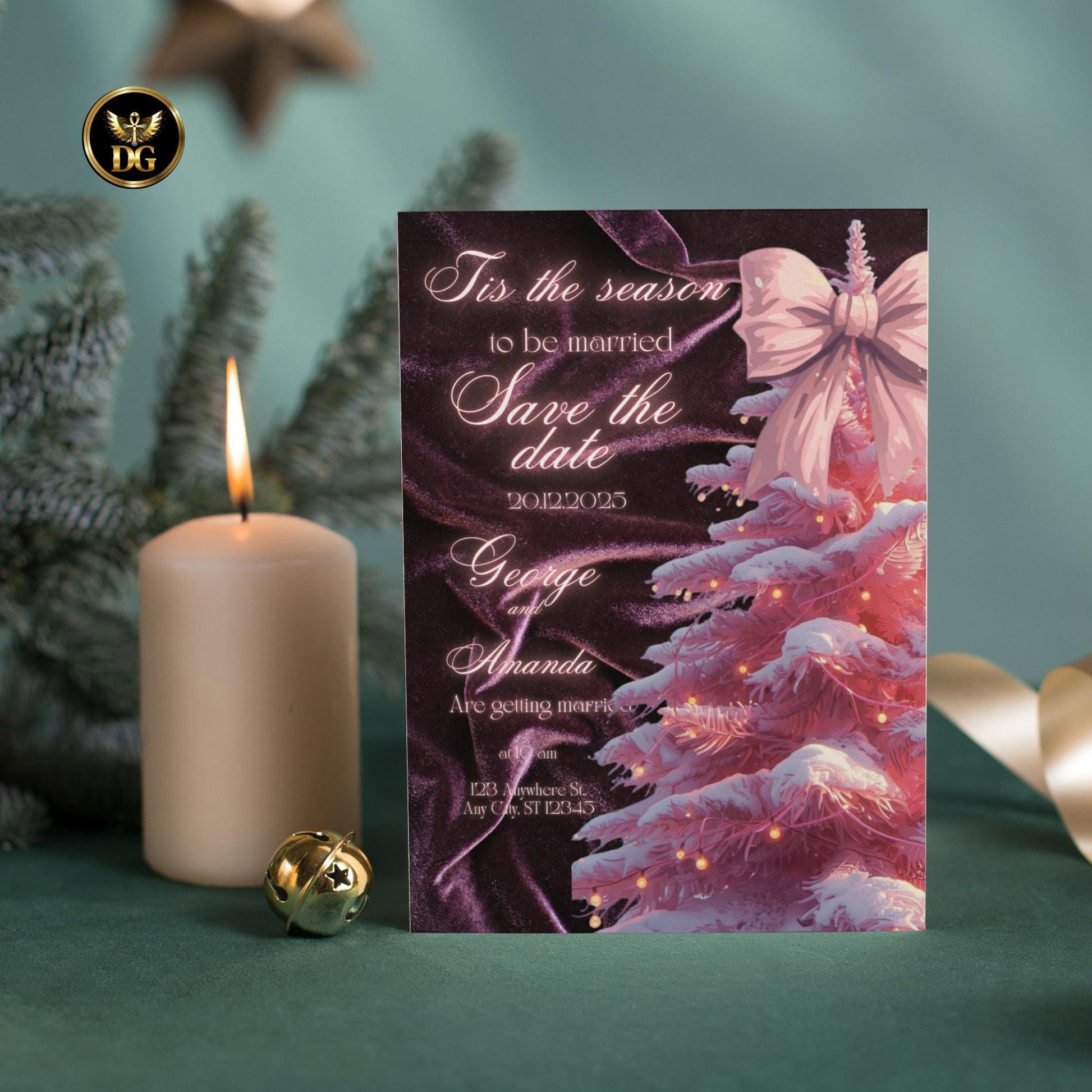 Embrace the magic of a winter wedding with our "It's the Season to be Married" invitation suite, where festive joy meets romantic elegance. This breathtaking bundle features a stunning blush pink Christmas tree, adorned with delicate twinkling lights, set against a luxurious deep purple velvet background that shimmers with sophistication. Topped with an elegant pink bow, this design is a dream come true for the modern, romantic celebration.