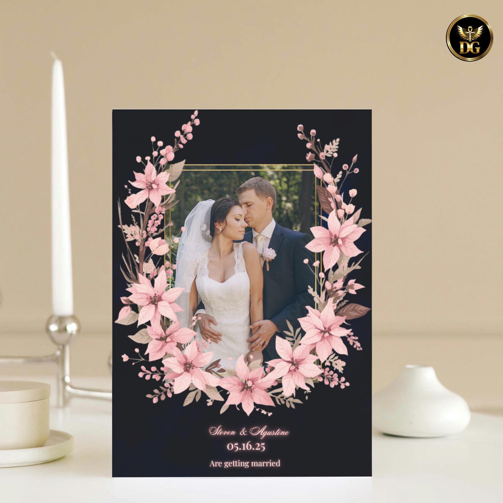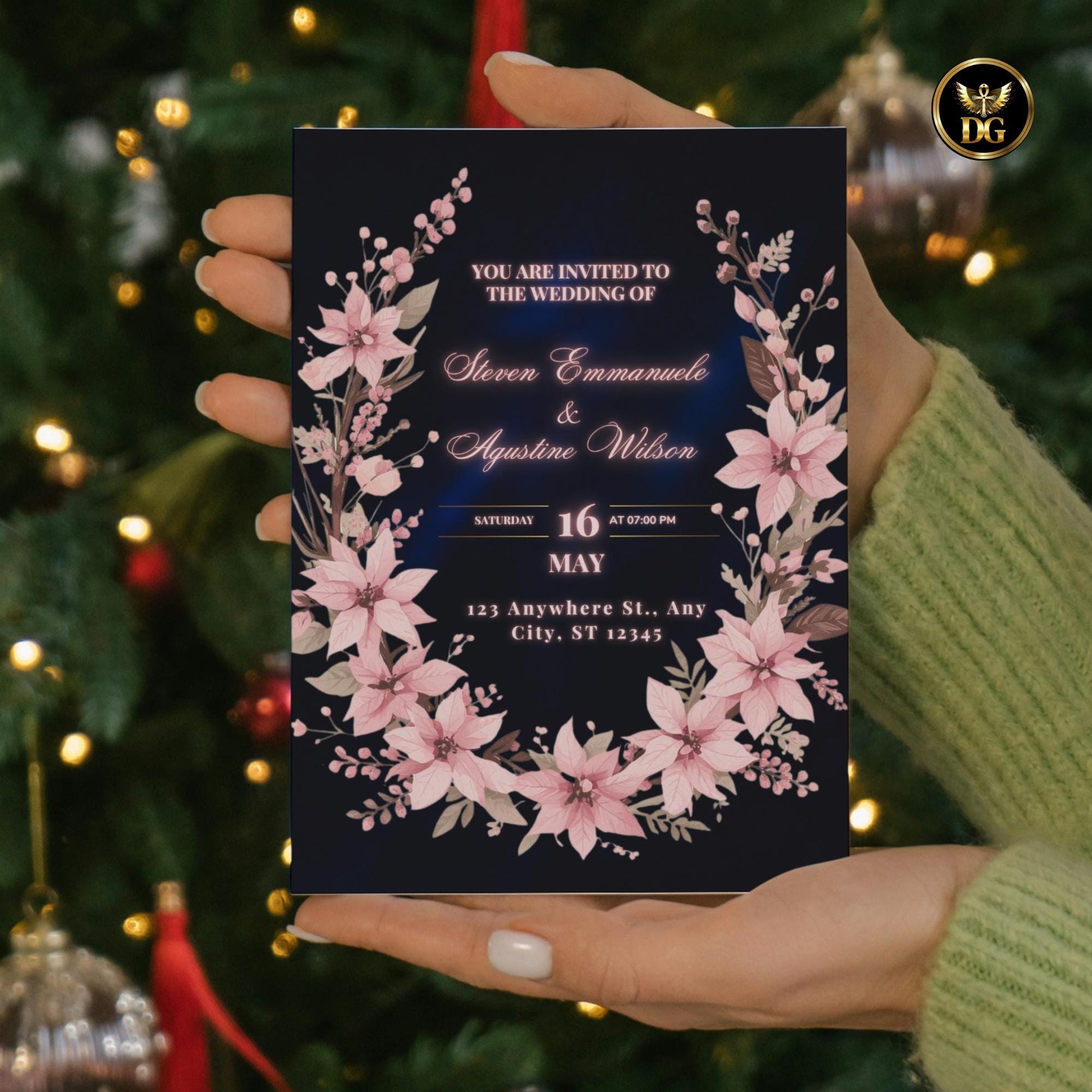 Each template showcases the soft beauty of the pink poinsettia Christmas bloom, wrapped in a delicate floral wreath that brings a festive-yet-elegant touch to your winter celebration. The navy velvet background adds depth, texture, and a sense of luxury that feels perfect for December weddings, holiday events, and chic seasonal ceremonies.