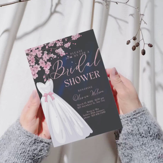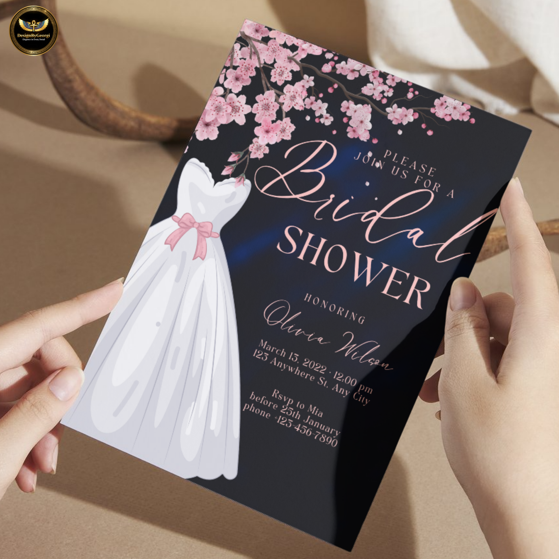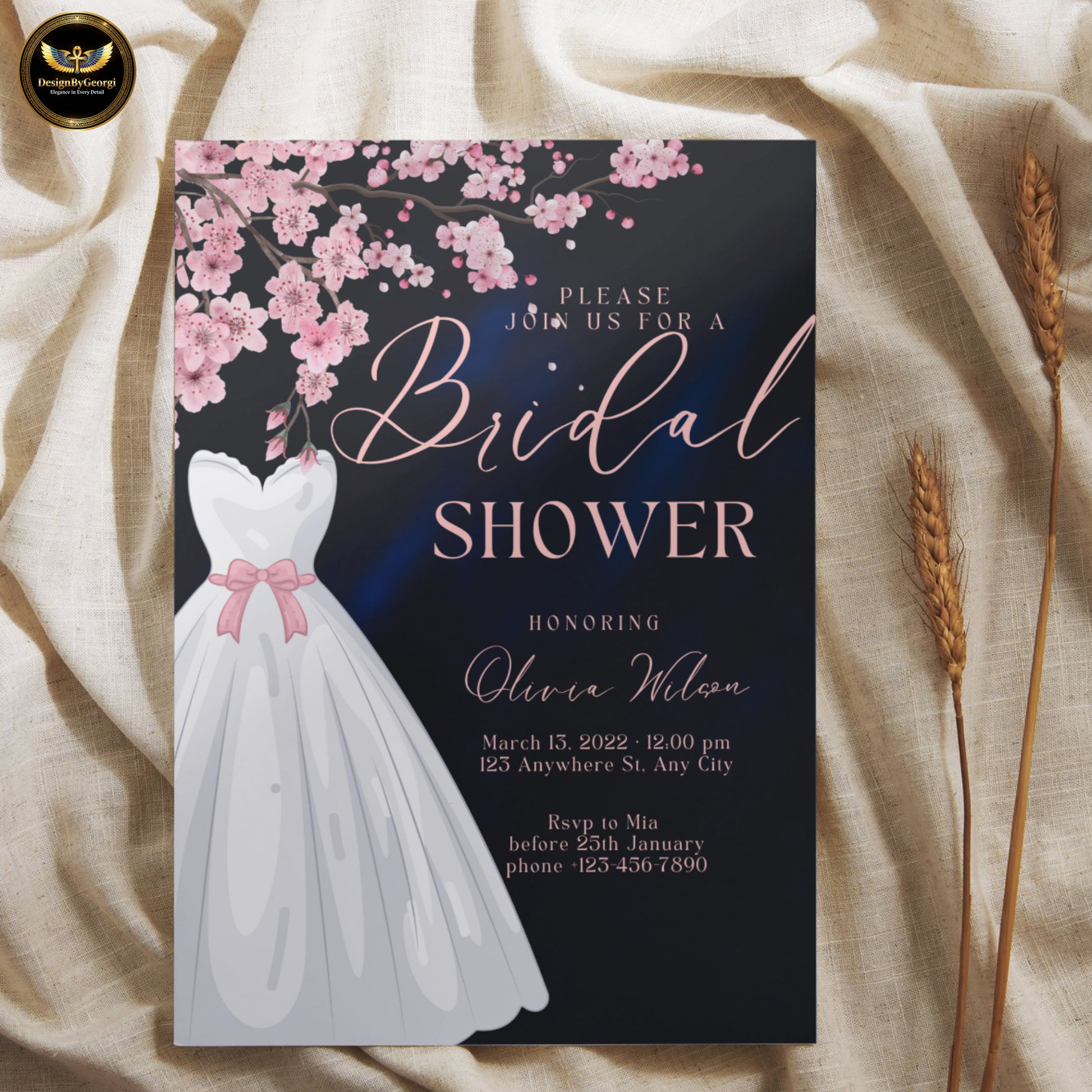 Celebrate the bride-to-be with this Elegant Navy Velvet Bridal Shower Invitation — a fully editable digital invitation featuring a luxurious navy velvet background, a delicate white wedding dress illustration with a pink bow belt, and a crown of cherry blossoms and branches in soft pink for a romantic and feminine touch.