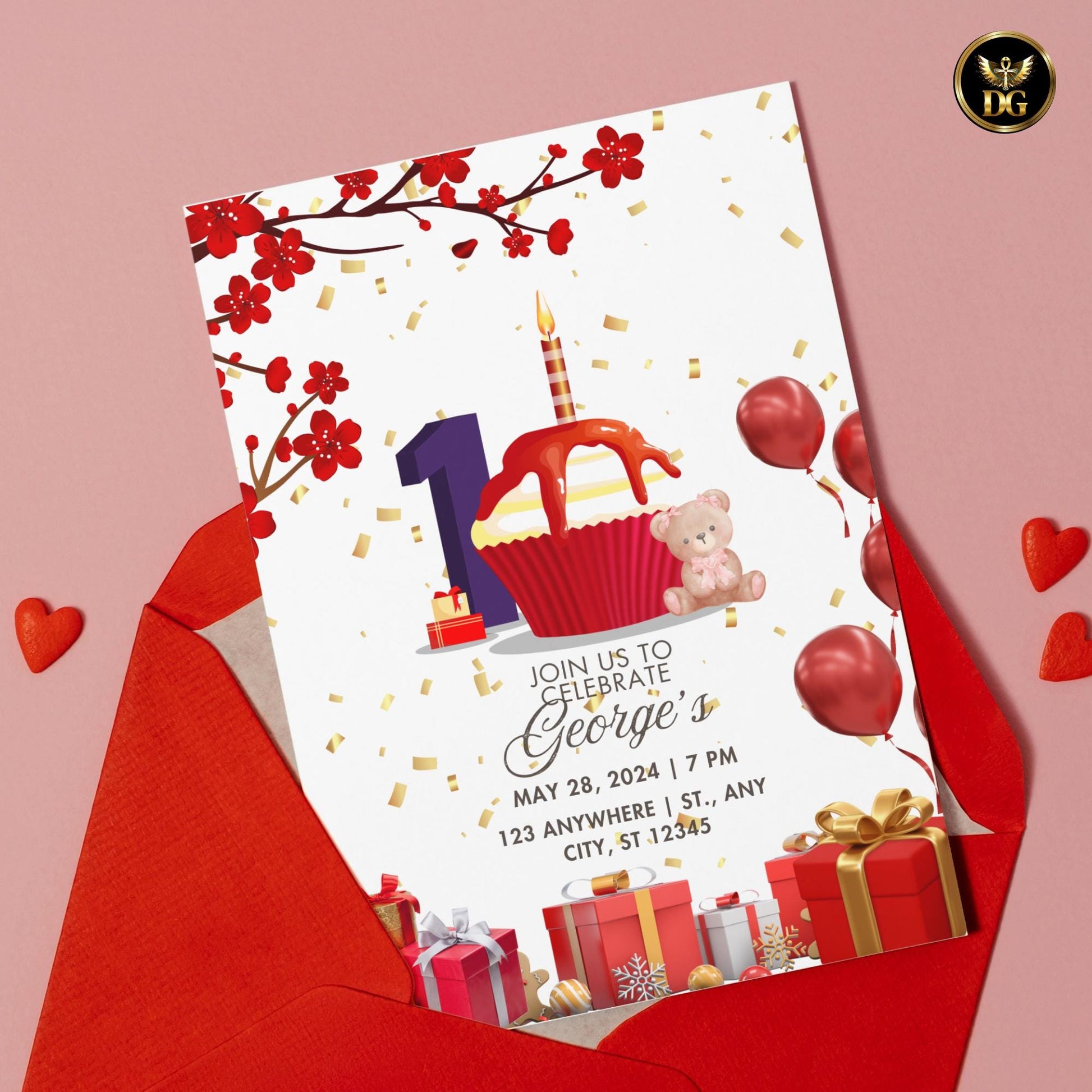 Featuring red and gold balloons, gifts, and a cute cupcake design — this printable Canva template is perfect for a 1st birthday or any kids’ celebration.