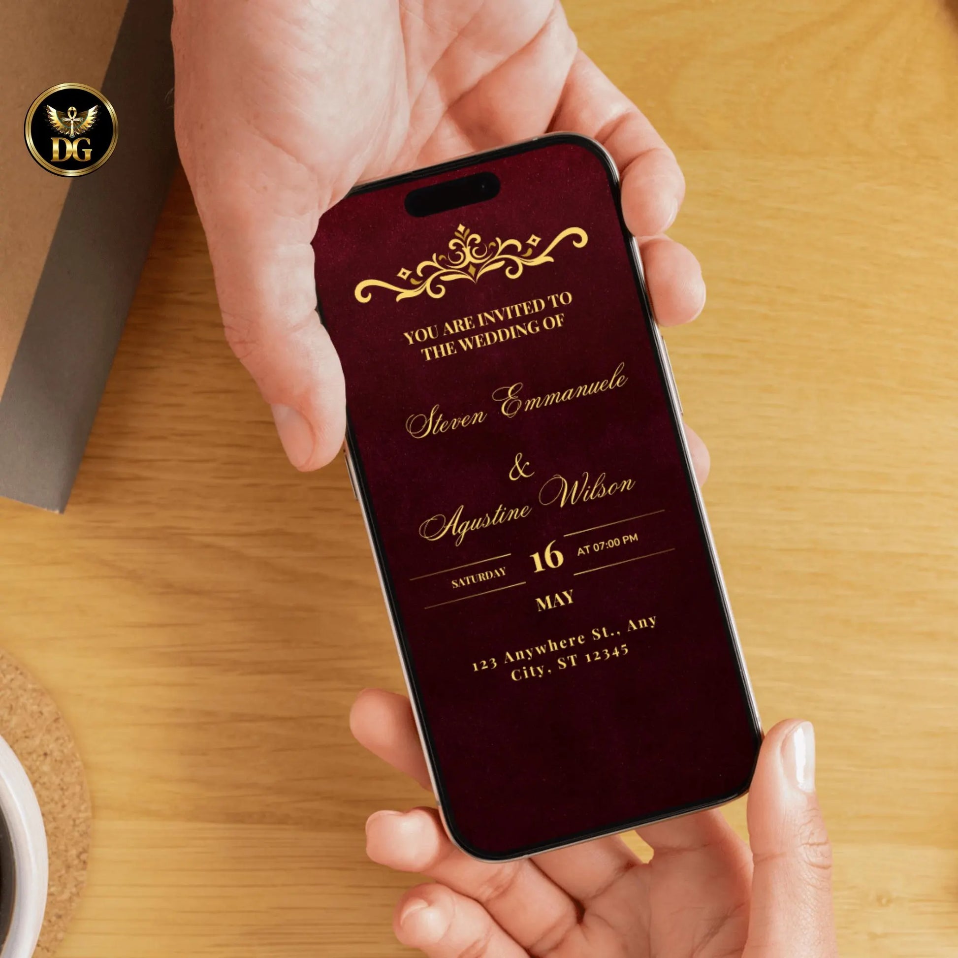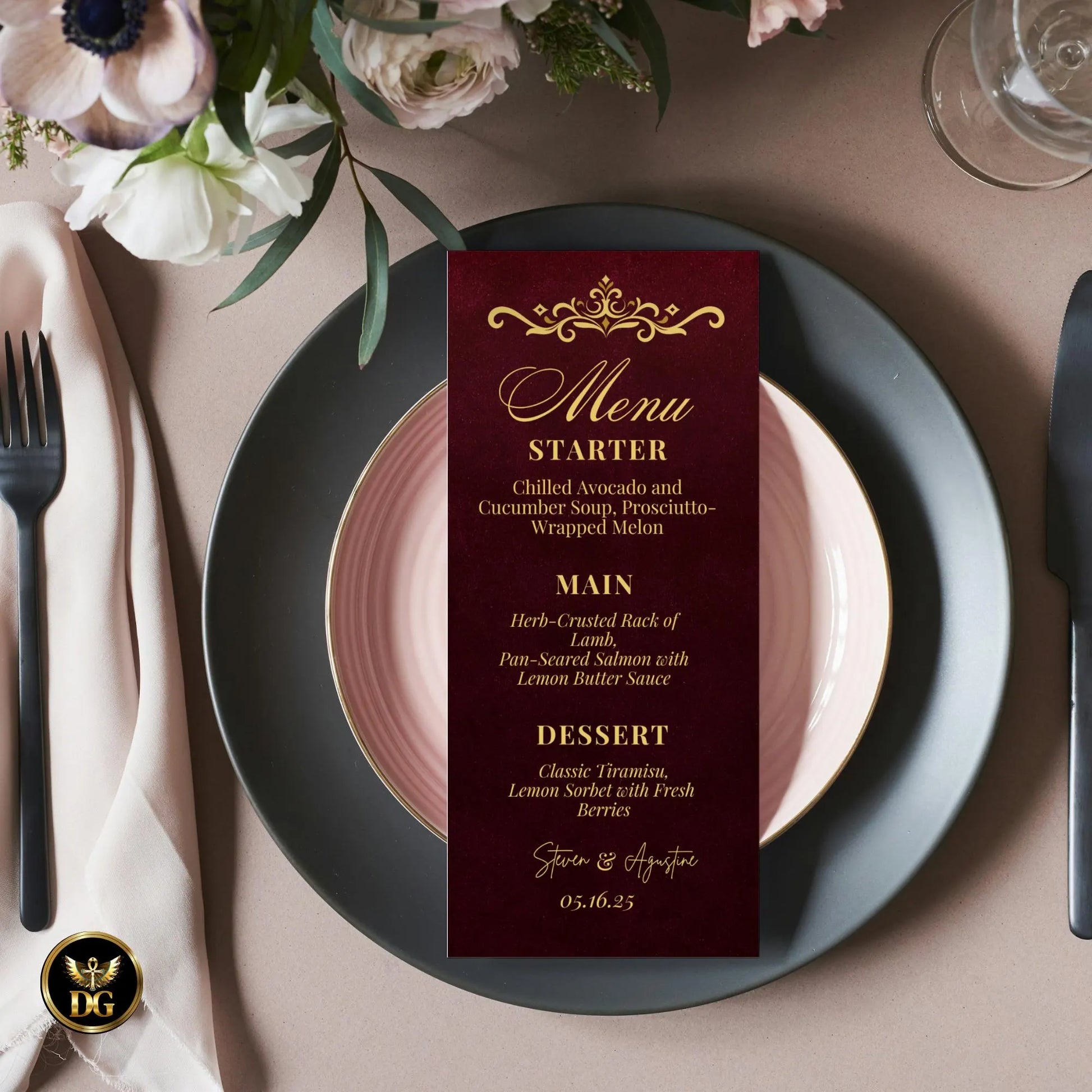 Featuring a deep burgundy velvet background, luxurious gold accents, and timeless typography, this elegant set exudes romance, sophistication, and warmth — ideal for a classic fall or winter celebration.