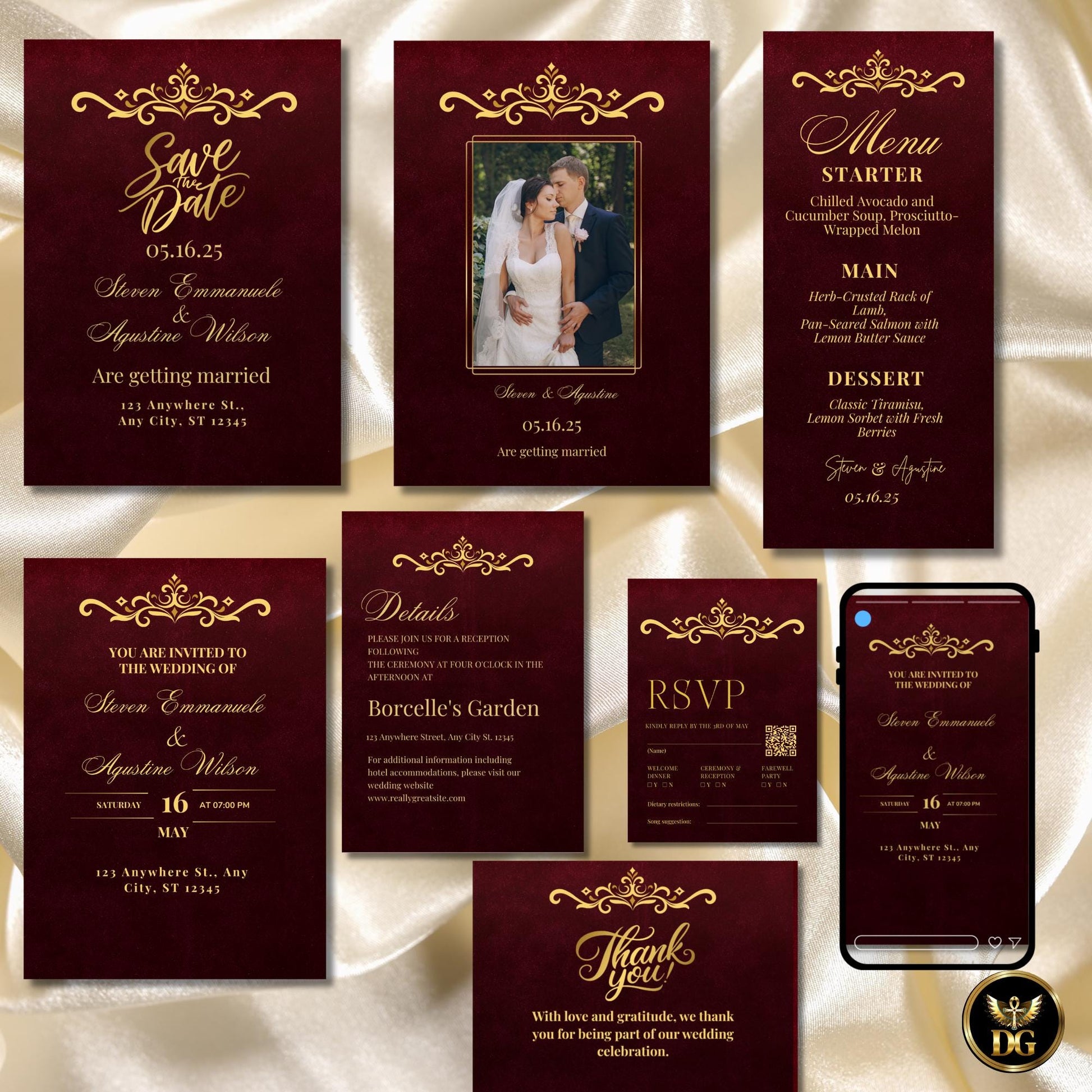 Featuring a deep burgundy velvet background, luxurious gold accents, and timeless typography, this elegant set exudes romance, sophistication, and warmth — ideal for a classic fall or winter celebration.