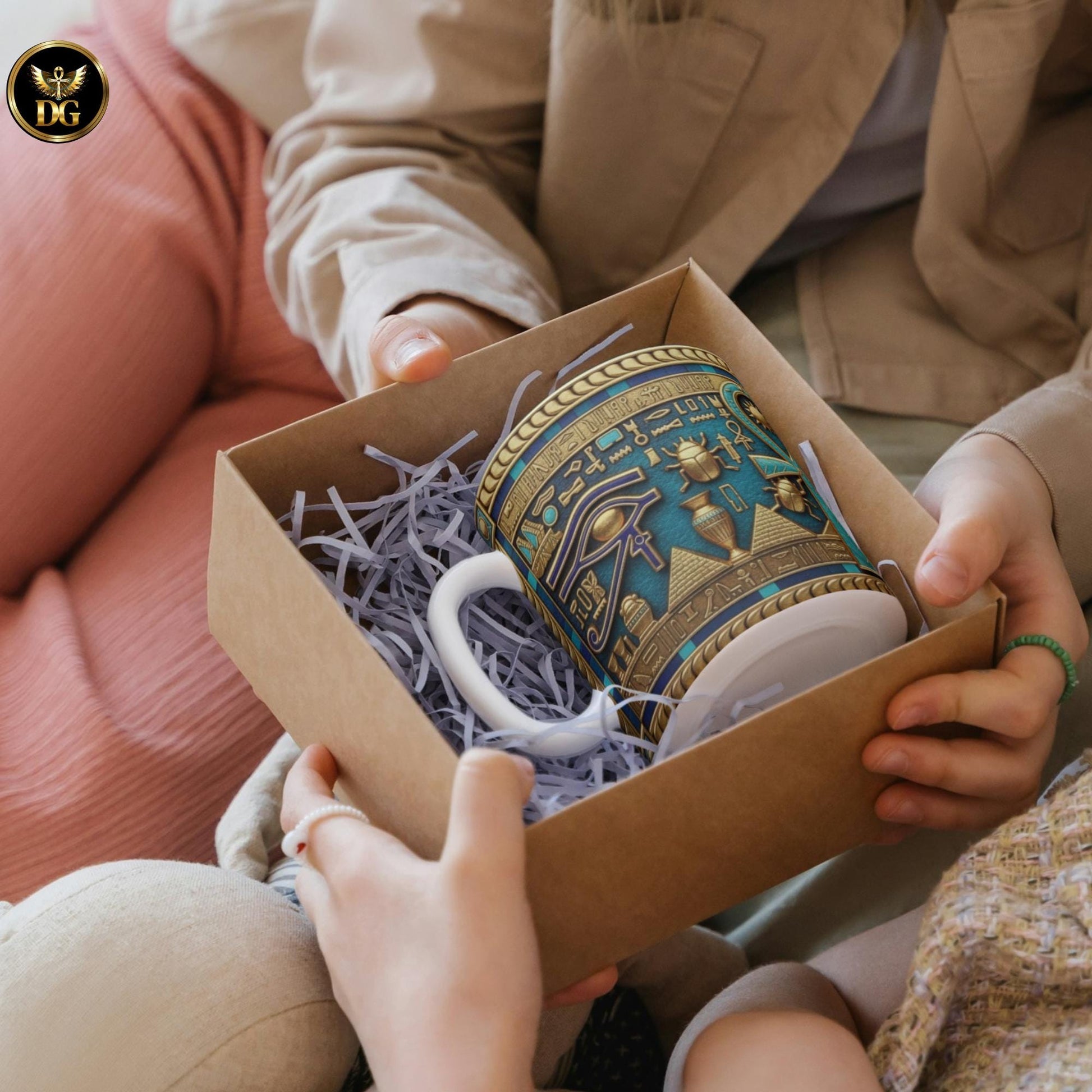 Hold a little piece of the Nile in your hands. This 11oz white ceramic mug wraps a turquoise-and-gold band of Egyptian motifs — ankhs, scarabs, pyramids and the Eye of Horus — around every sip. It feels grounded on the morning table and ornate when guests notice the intricate border. The rounded C-handle sits comfortably in your fingers. Use it for strong black coffee during dawn readings or for a calming chamomile while you plan your next museum visit. The design brings a quiet sense of history and wonder into everyday rituals, inviting slow moments and small ceremonies.
