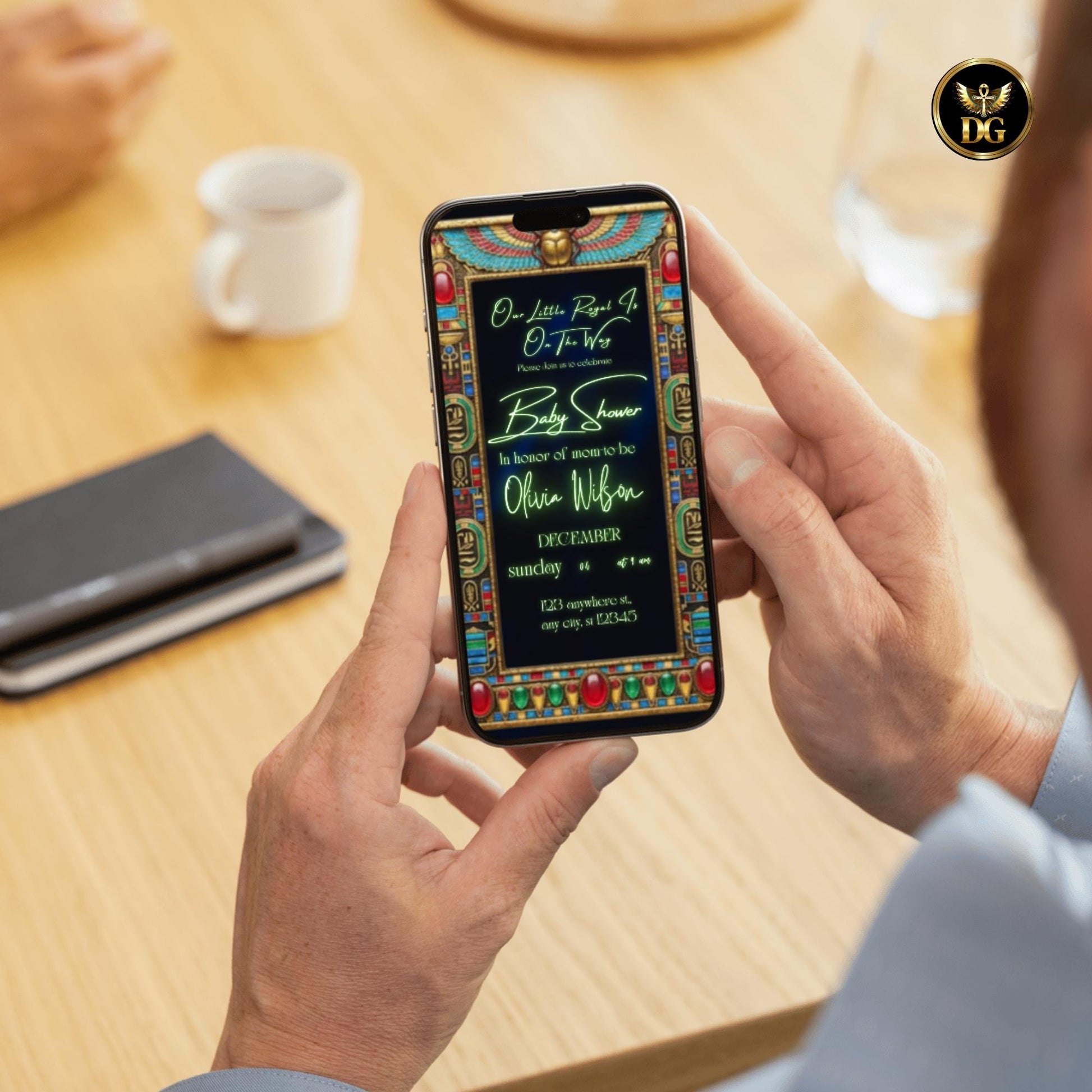 Every detail is intentional: the navy blue of depth and elegance, the jewels of celebration and abundance, the gold of power and blessing, and the turquoise of renewal and joy. Together, they create a vibrant, unforgettable invitation worthy of a royal baby shower.