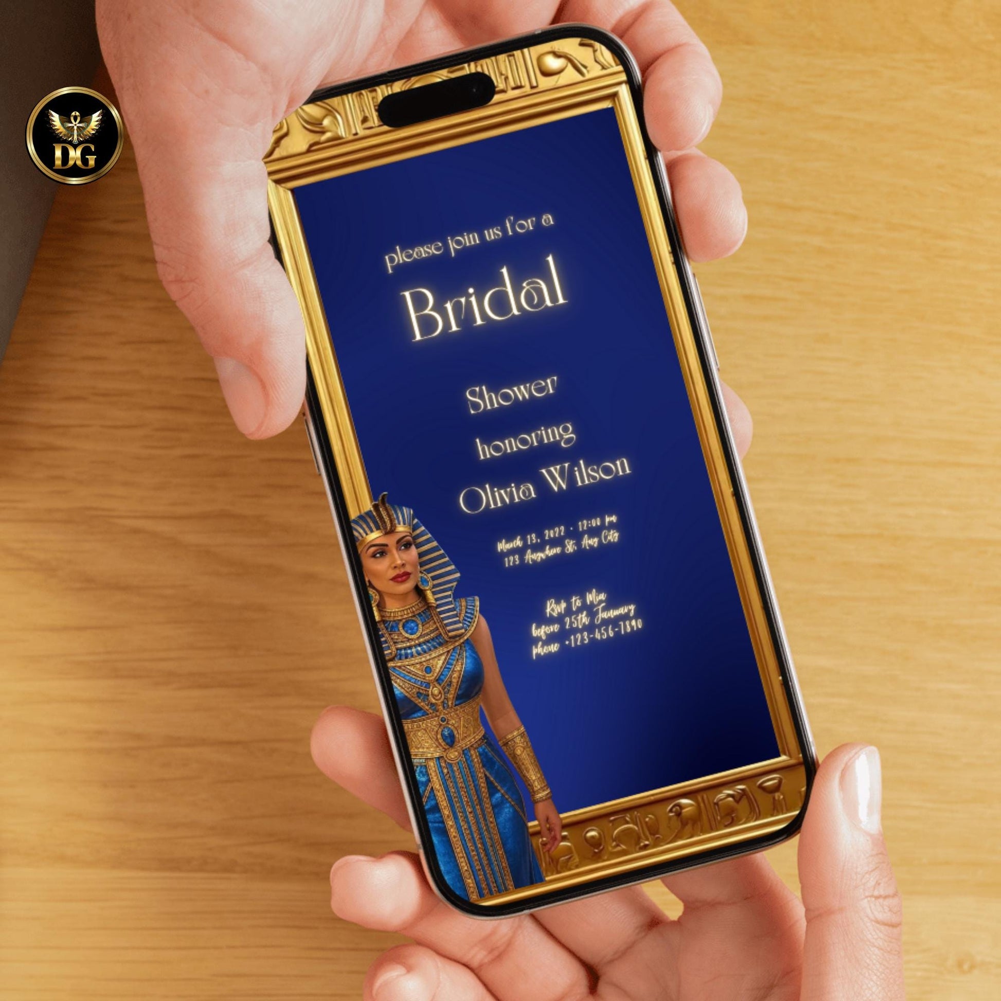 Celebrate the timeless elegance of Ancient Egypt with our exclusive digital bridal shower invitation. Featuring a majestic golden frame, authentic hieroglyphic accents, and a beautiful Egyptian bride in a stunning blue gown, this design brings the grandeur of our ancestors to your special celebration.