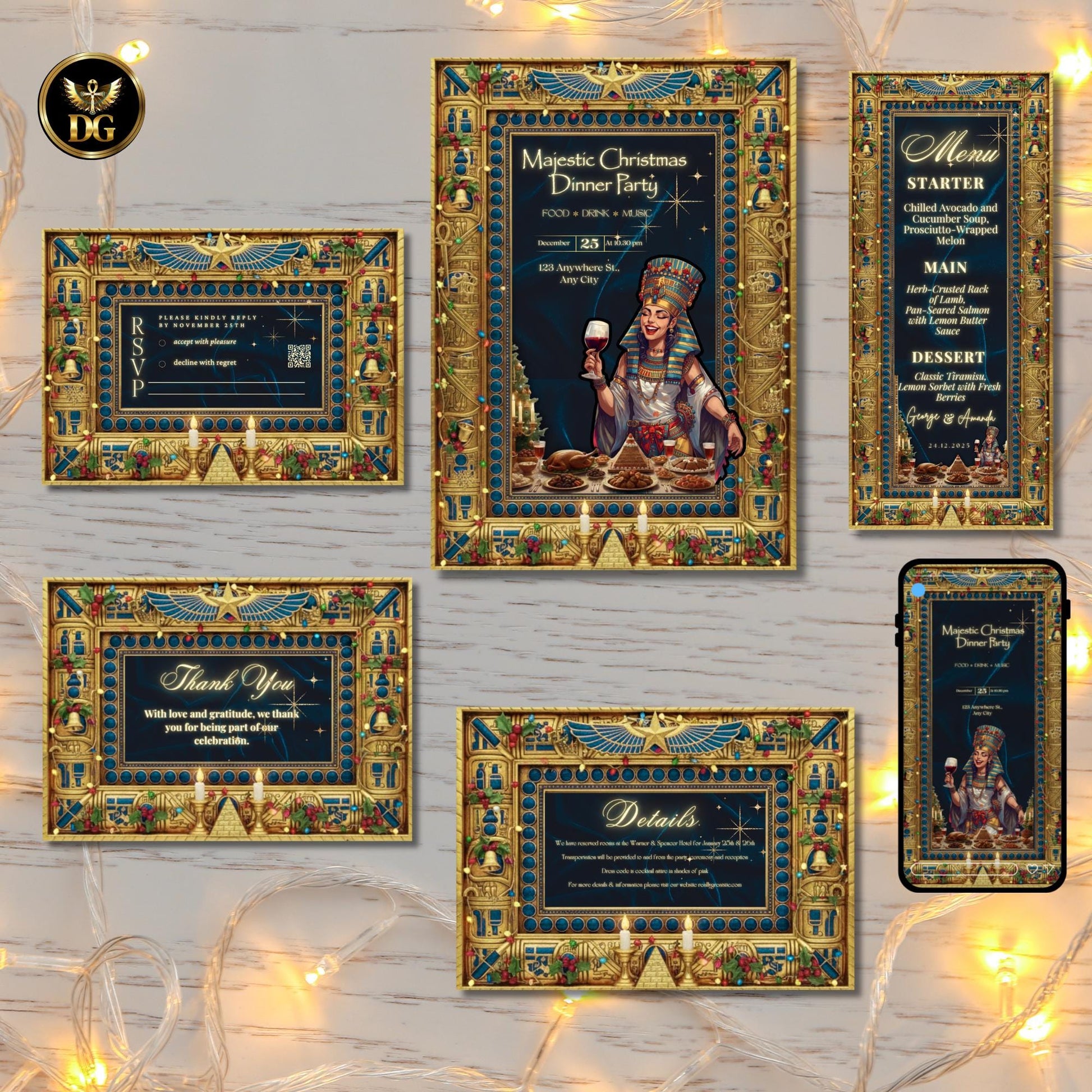 Egyptian Christmas Dinner Party Bundle | Pharaonic Golden Invitation Set | Royal Ancient Egypt Theme Canva Templates for Luxury Events"