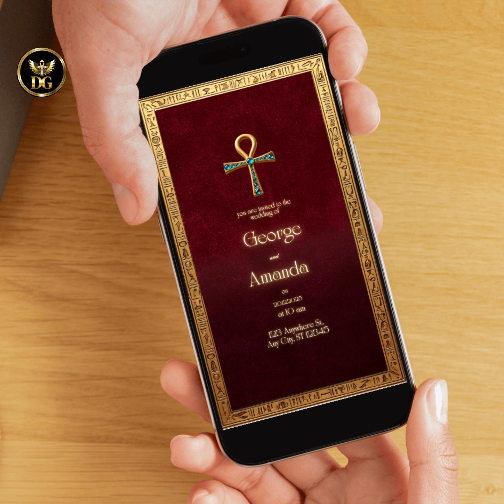 Egyptian Red Velvet Invitation Gold Hieroglyphic Frame Ankh Jewel | Wedding & Bridal Shower Digital Template