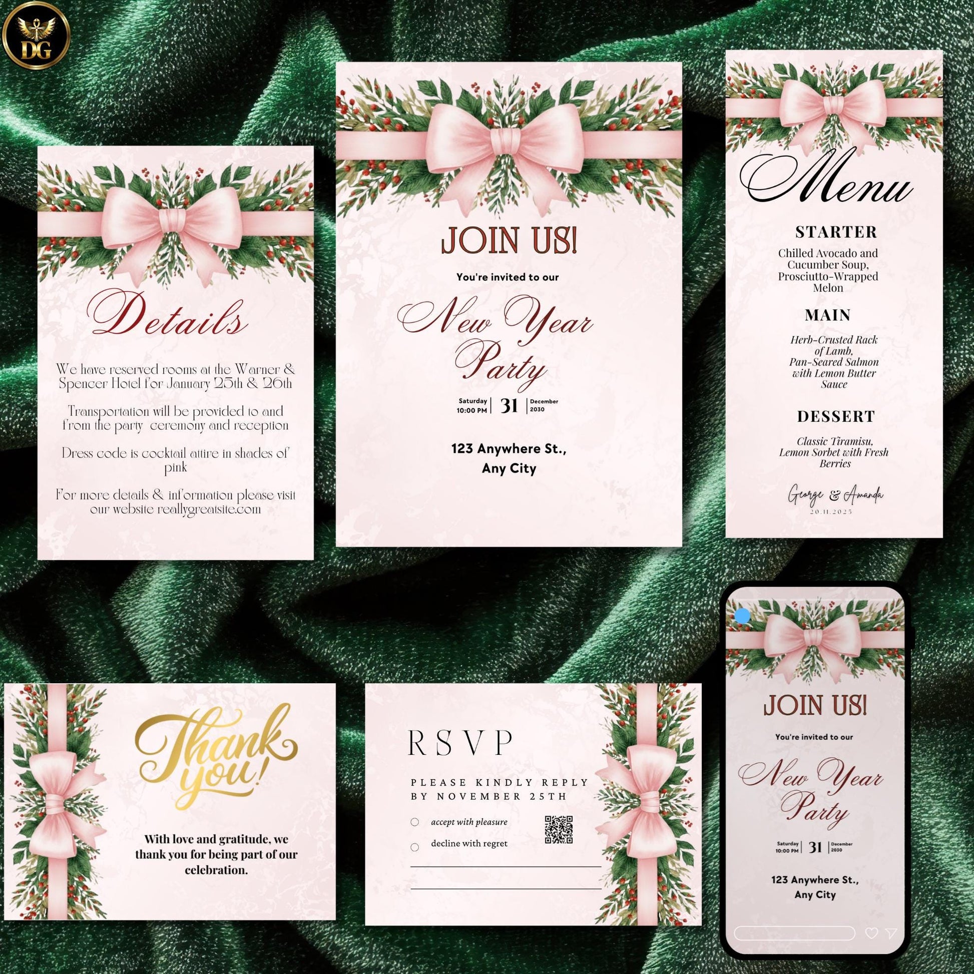 Ring in the New Year with elegance and sparkle! This Luxury New Year’s Eve Party Invitation Set is designed to make your celebration unforgettable. Featuring a soft pink and gold theme with a light pink bow, lush holiday greenery, and festive berries, this digital invitation bundle adds a touch of glamour to any event — from classy countdown parties to cozy at-home celebrations.