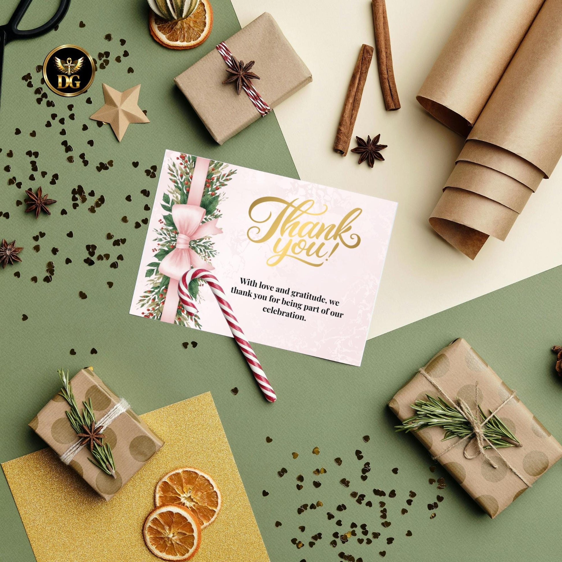 🌸 Elegant Design: A sophisticated pink and gold background with light pink bows, festive greenery, and Christmas berries — blending holiday magic with modern luxury.