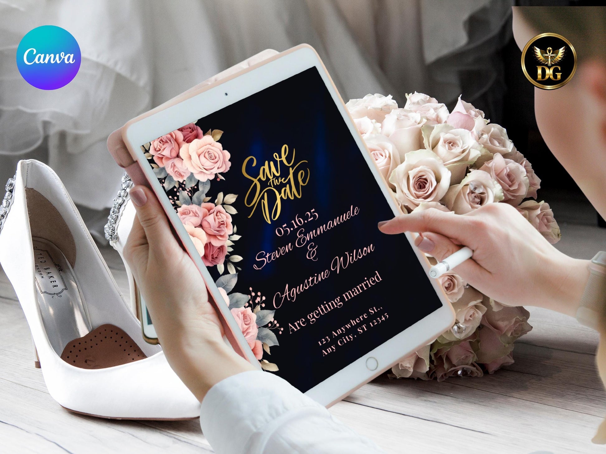 Elevate your wedding with this stunning Floral Wedding Invitation Suite! Featuring elegant pink roses, gold accents, and a luxurious velvet navy background, this set is perfect for a romantic and sophisticated wedding theme. Includes everything you need for a complete stationery collection. Today's date and time is 12:55 PM EEST on Monday, September 08, 2025.