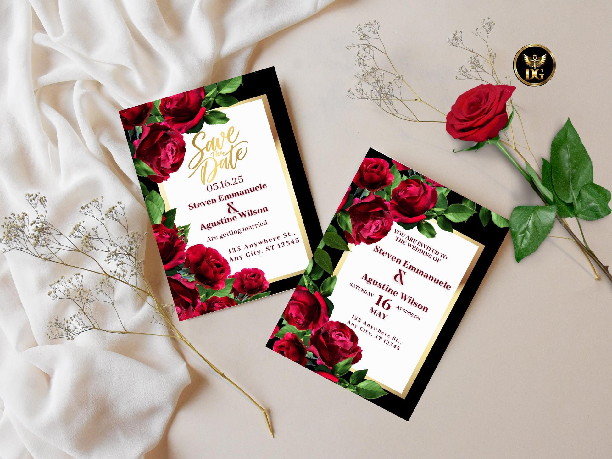 Limited Time Offer: 50% OFF! Create your dream wedding with this elegant rose-themed invitation suite template! Featuring lush red roses and chic gold accents, this customizable set includes all essentials for a stunning wedding. Perfect for any couple to personalize for their special day.