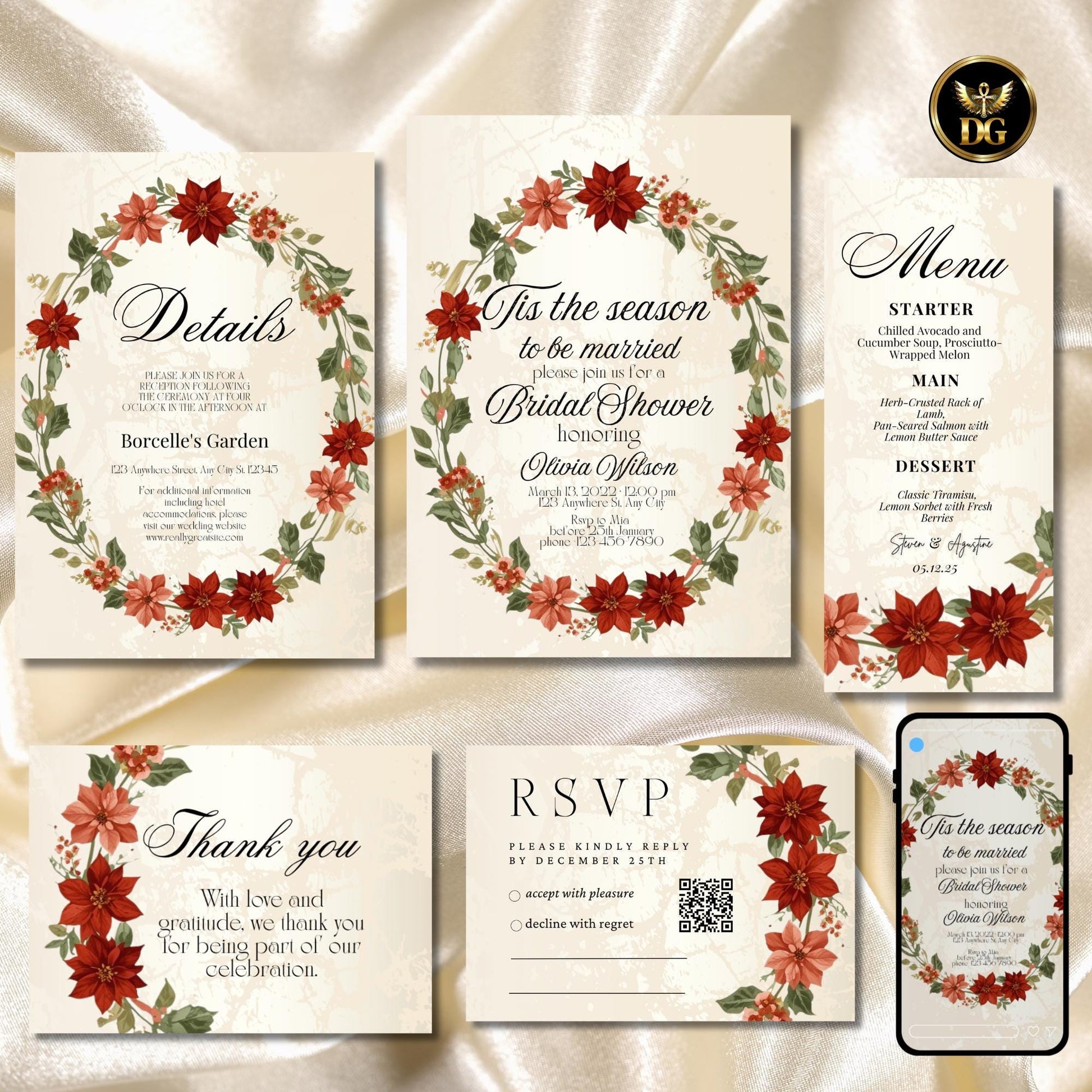 Elegant 'Tis the Season' Bridal Shower Suite | Cream Gold & White Floral Wreath | Editable Canva Template