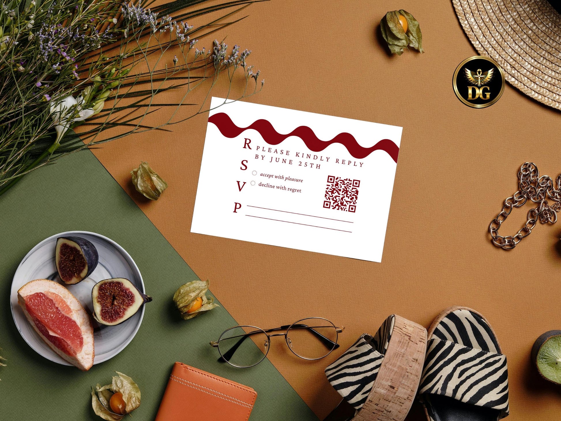 Elegant White Wedding Invitation Suite with Red Wavy Accent | Editable RSVP, Details & Invite | Modern Trendy Wedding Stationery