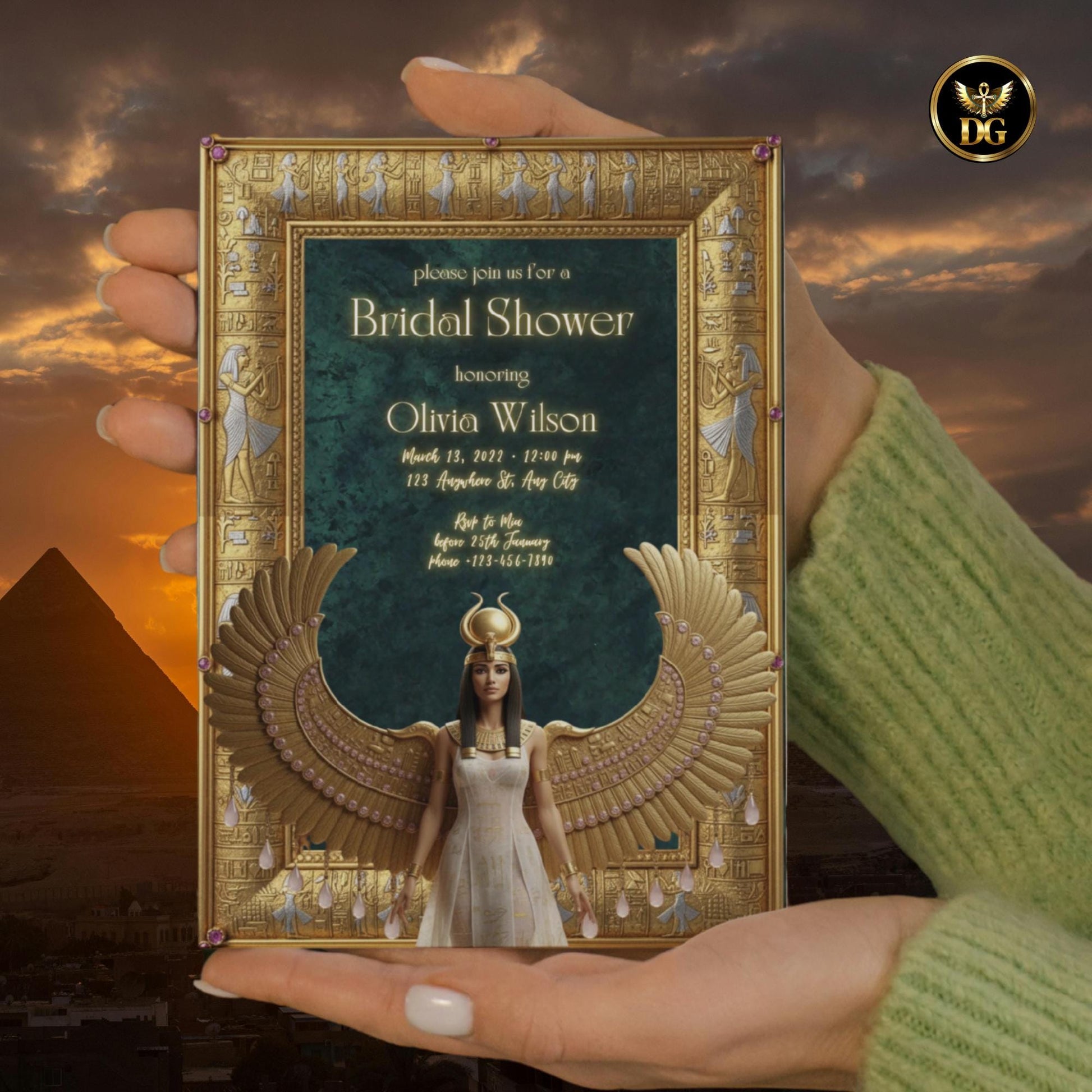 egyptianbridal, isistheme, emeraldinvitation, goddessparty, luxurybridal, canvatemplate, digitaldownload, goldandgreen, ancientegypt, divinefeminine, musicaltheme, velvetbackground, royalcelebration