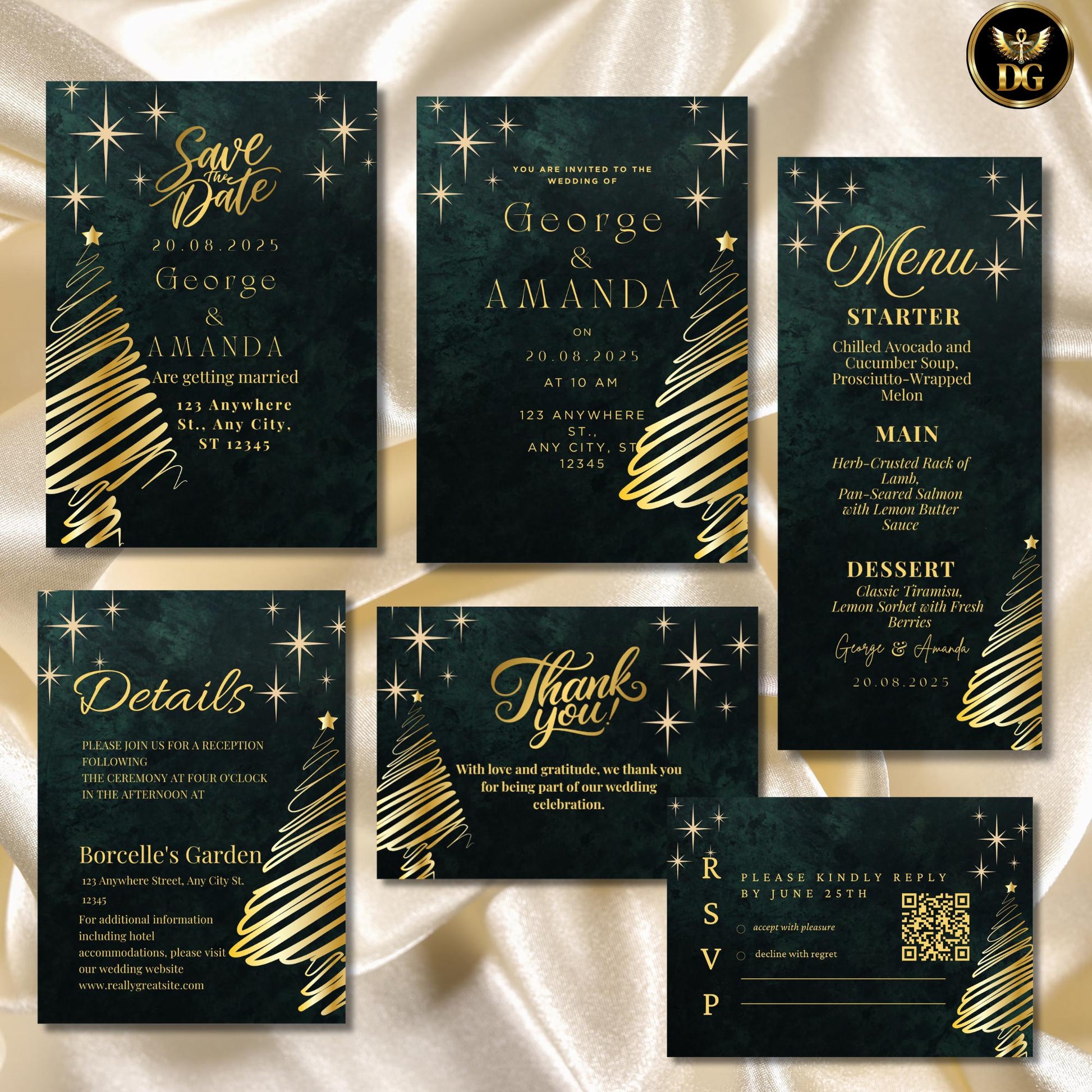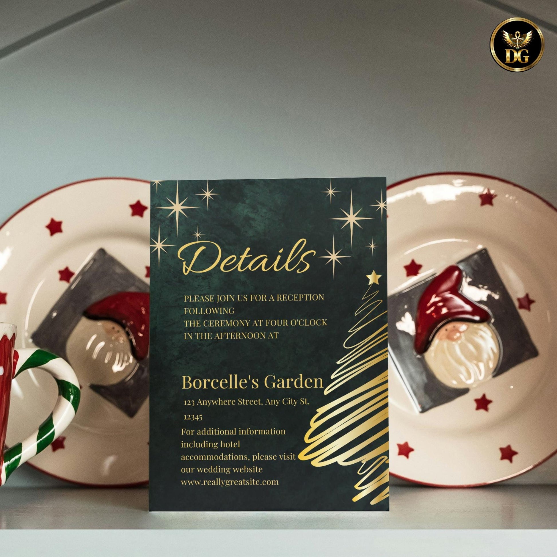 Celebrate your magical Christmas wedding with this luxurious Emerald Green and Gold Wedding Invitation Template Set – a stunning mix of festive charm and timeless elegance.