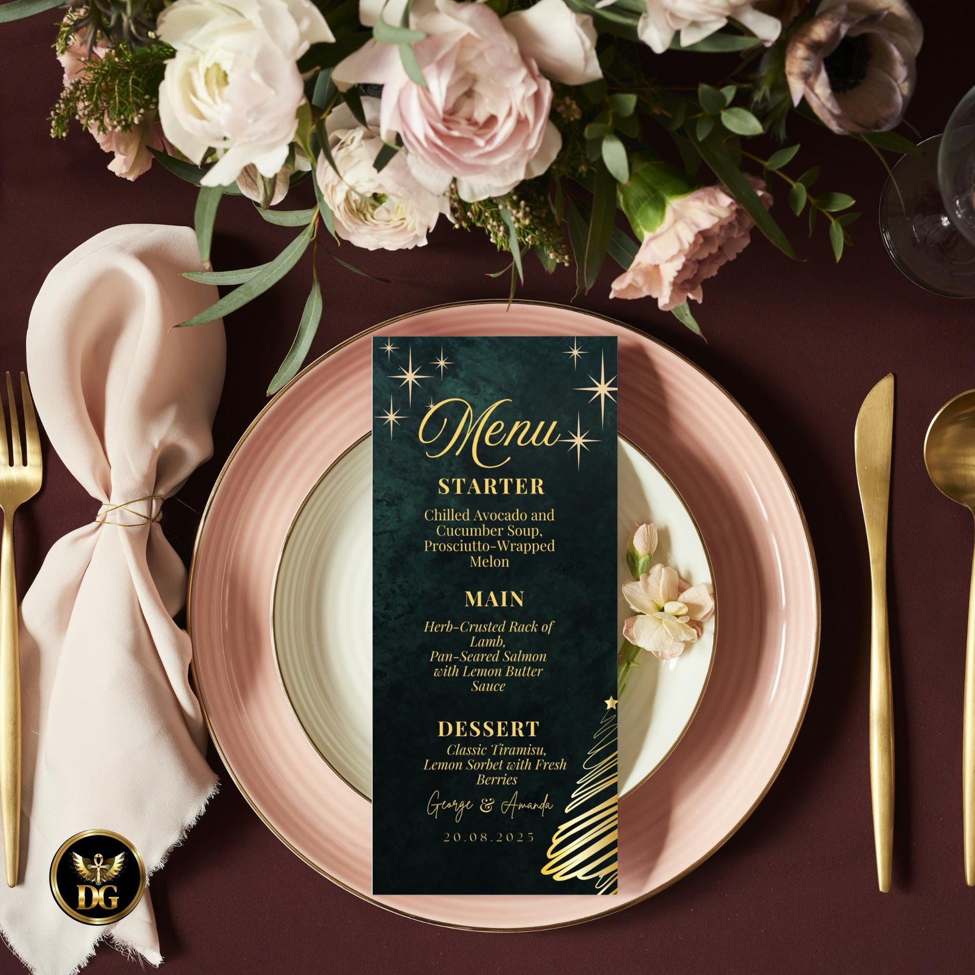This design captures the warmth of Christmas with the elegance of emerald and gold — perfect for couples who want a holiday feel with luxury flair.