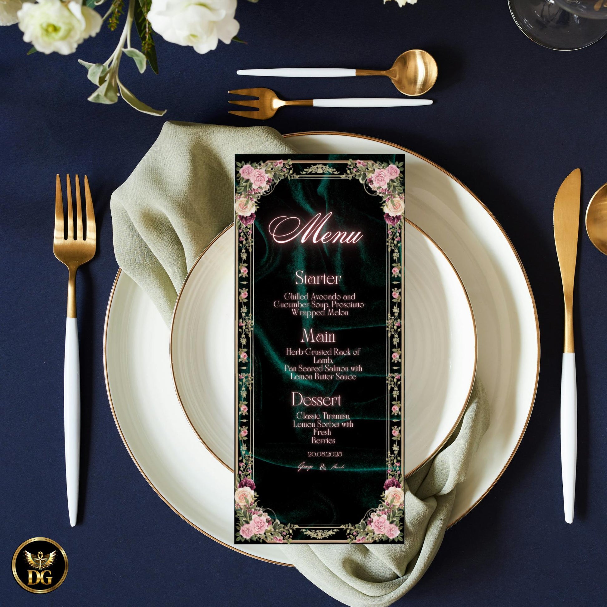 Indulge in the rich sophistication of our Emerald Velvet Elegance Invitation Suite, inspired by the opulent grandeur of traditional velvet designs. Featuring an exquisite floral frame set against a sumptuous emerald velvet backdrop, this suite is crafted for couples who desire a celebration defined by timeless luxury, dramatic elegance, and regal refinement.