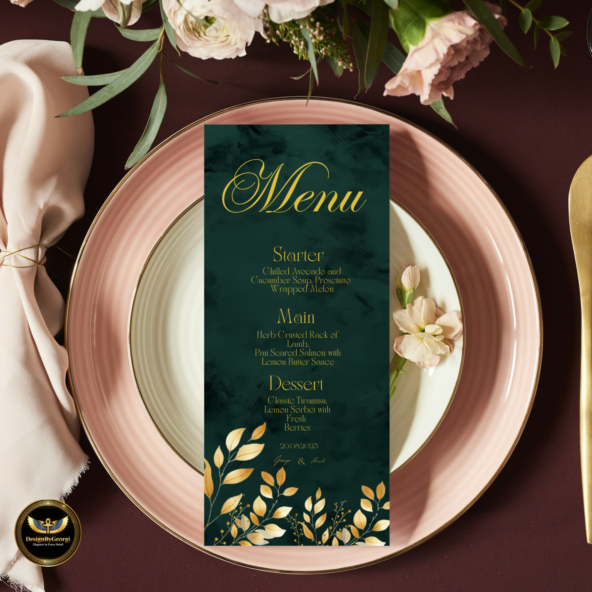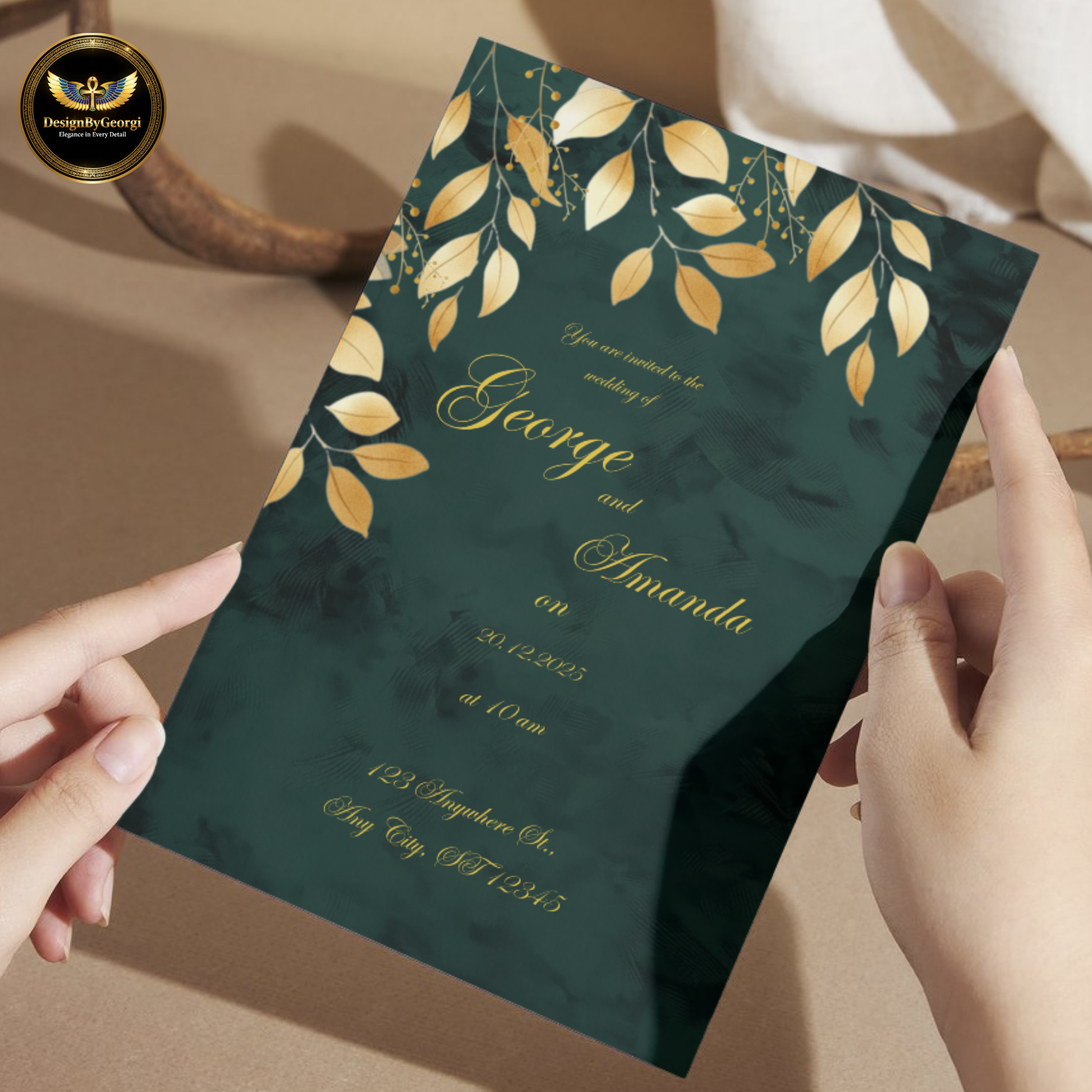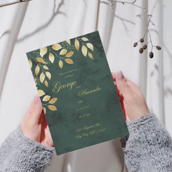 Elevate your wedding stationery with this luxurious emerald velvet invitation suite, featuring delicate golden leaves and elegant botanical accents. The deep emerald green velvet-style background radiates sophistication and timeless luxury, perfectly complemented by a refined layout and elegant typography—ideal for couples seeking a high-end, modern, yet romantic design.