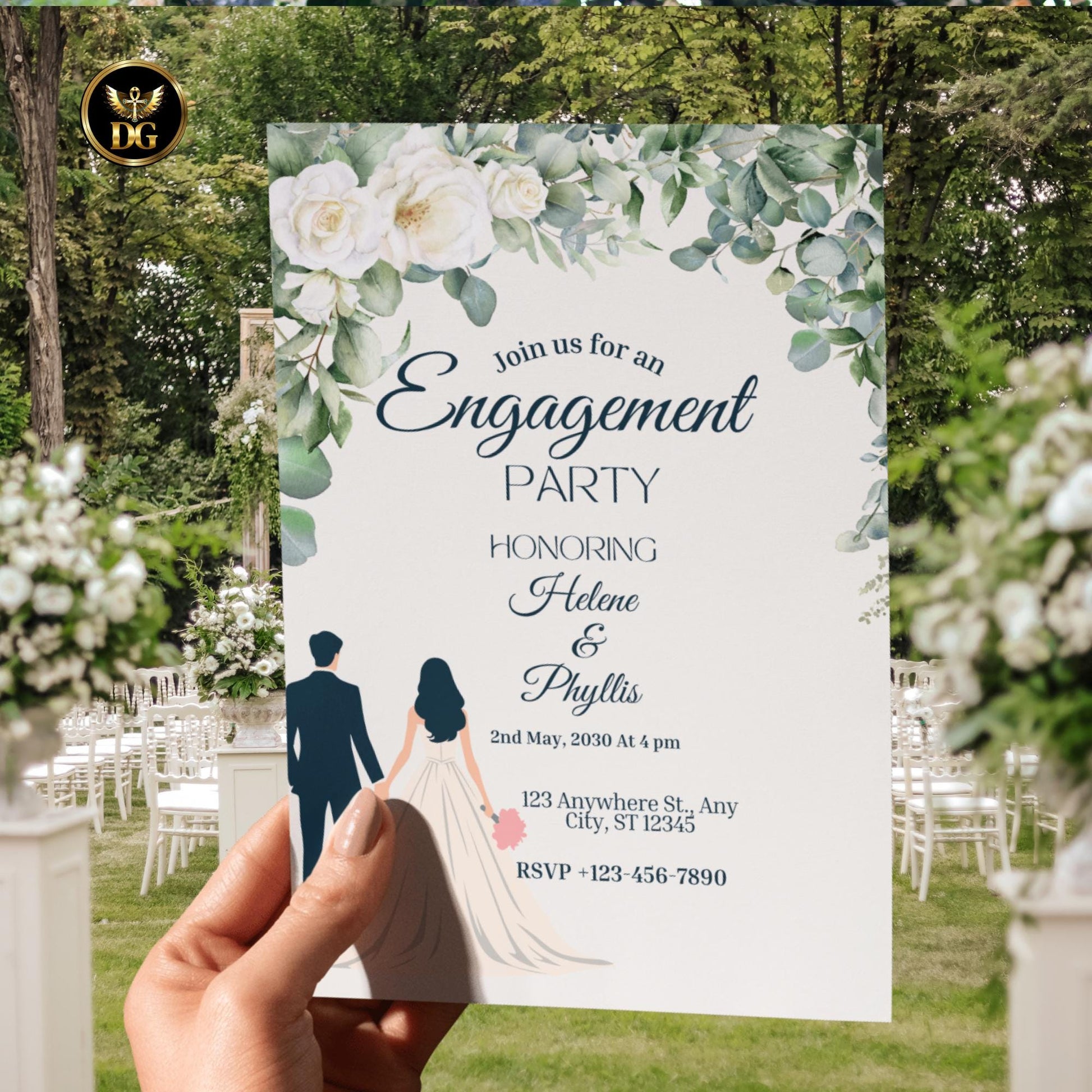 This premium digital template for your engagement party invitation is expertly designed to make your announcement unforgettable. It features a modern, elegant aesthetic with a soft white background and a delicate border of green foliage and white flowers, adding a touch of romance and nature to your special occasion.