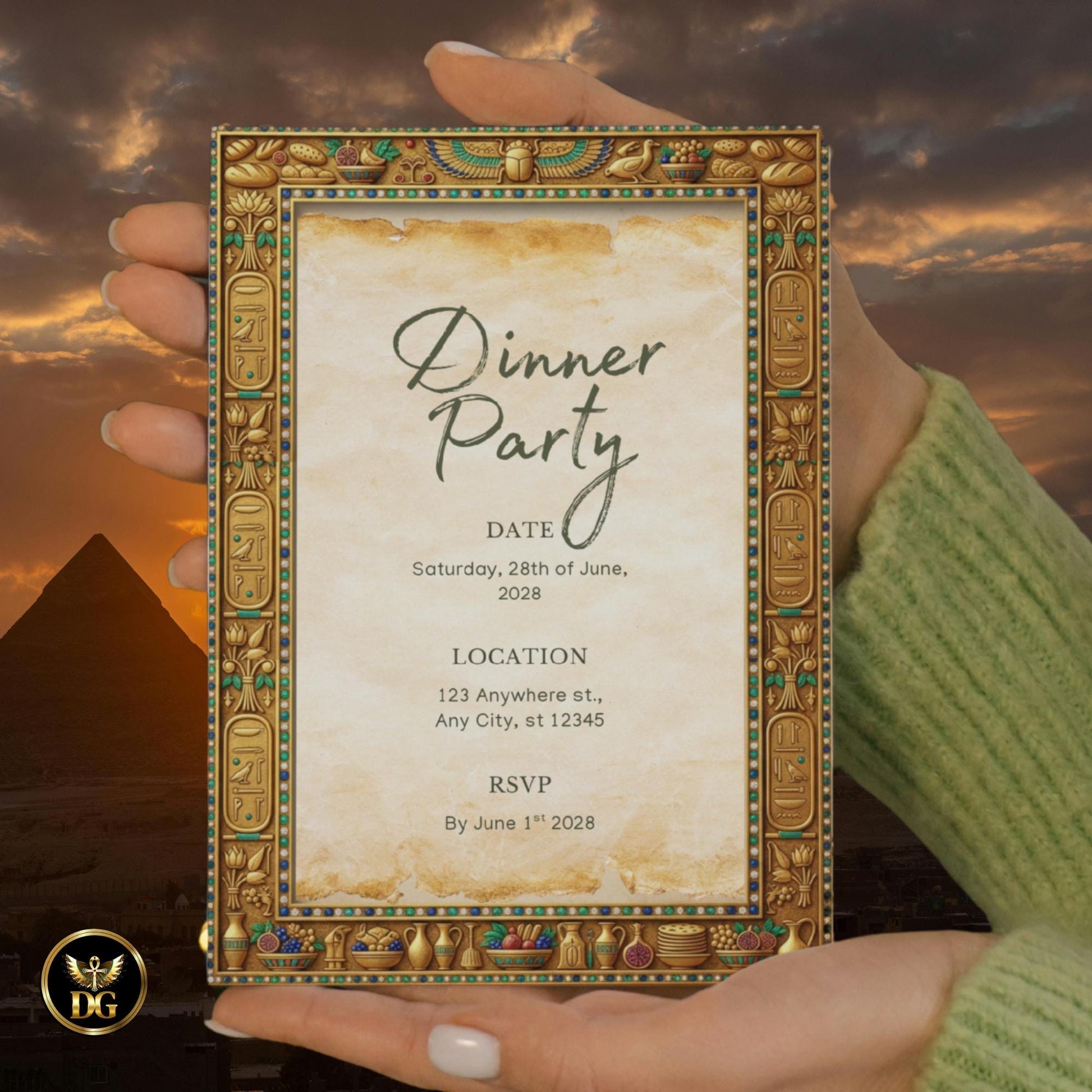 Honor the Pharaohs! Step into a world of timeless beauty and royal elegance with this Egyptian-Themed Dinner Party Invitation Template — inspired by the grandeur of our ancestors, the Pharaohs who defined beauty, art, and eternity.