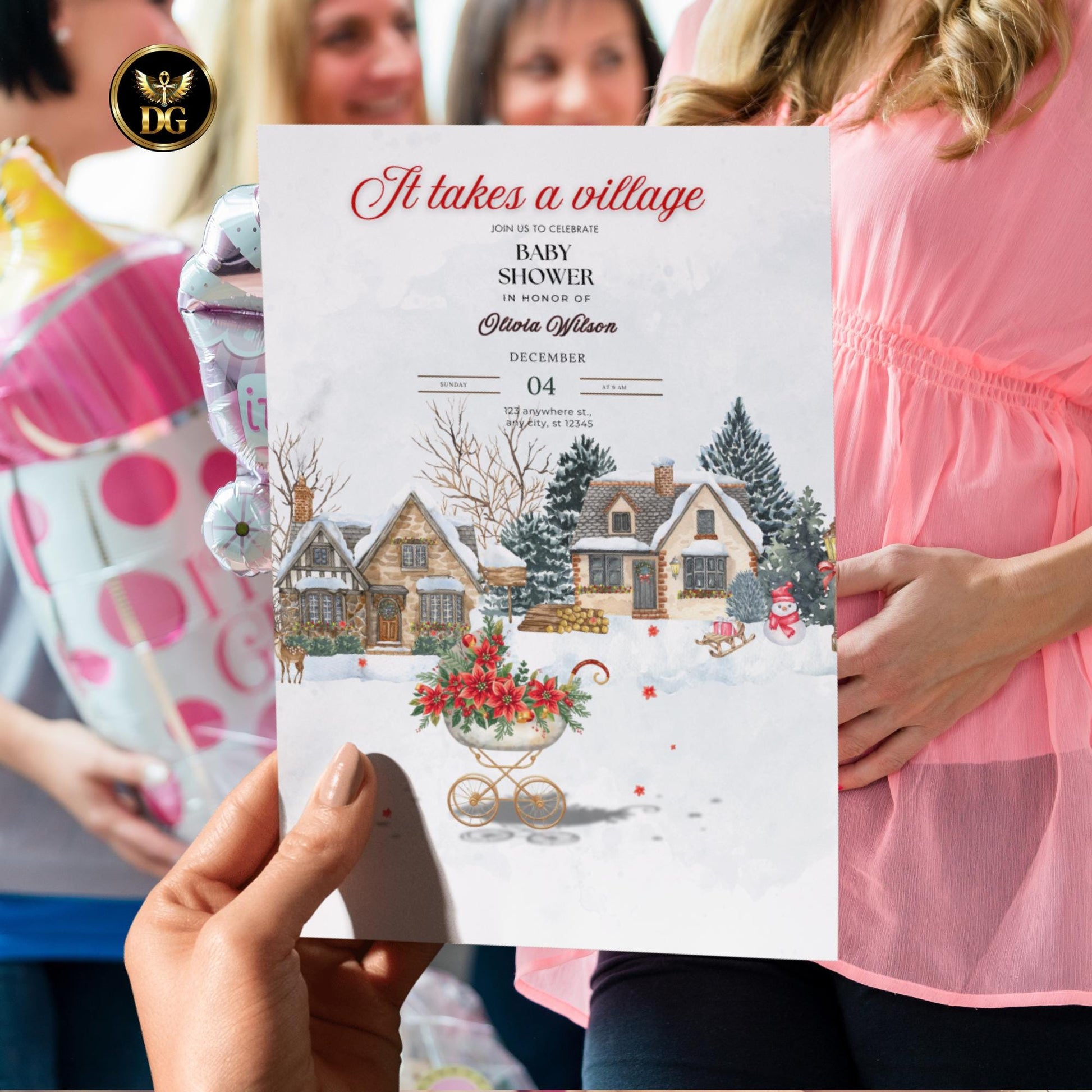 Each design captures the cozy spirit of the holidays with delicate watercolor details — snowflakes, soft greenery, and warm festive tones — creating an enchanting “It takes a village” theme that celebrates love and togetherness.
