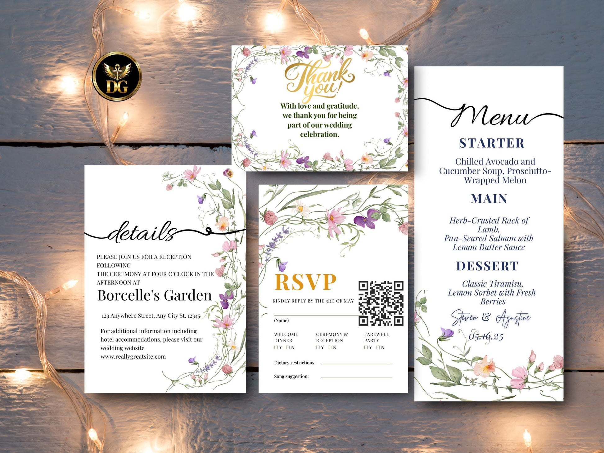 Floral Boho Wedding Invitation Suite Printable Save the Date Invite Menu, RSVP Digital Download Printable Invitation Template Editable Canva