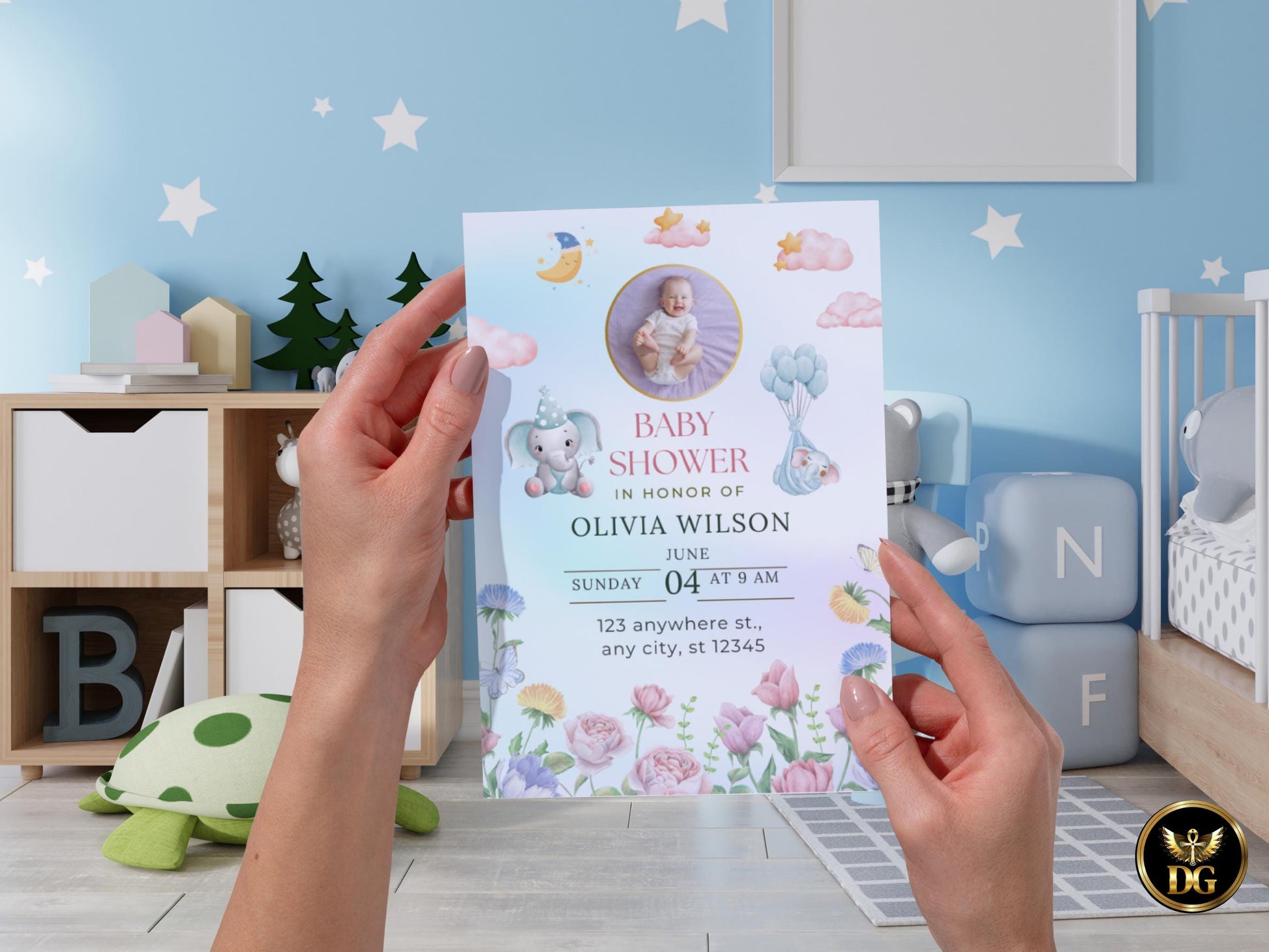 Welcome to our adorable Baby Shower Invitation Template! This charming digital design features a whimsical elephant theme with stars, moon, clouds, and colorful floral accents. Perfect for celebrating the arrival of a little one, this set includes everything you need to create a personalized invitation for your baby shower.