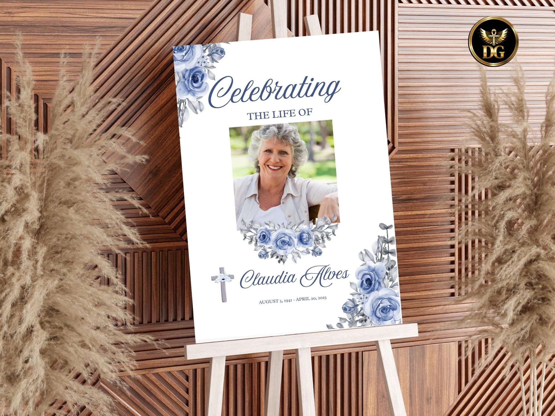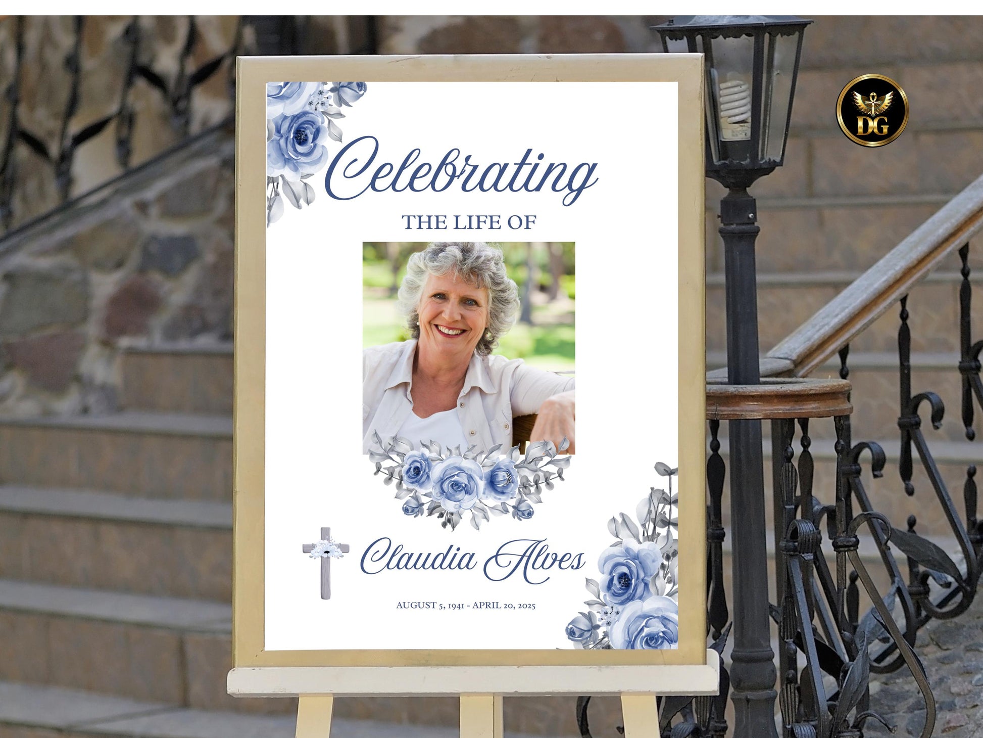 Honor your loved one’s memory with this white and light blue funeral welcome sign. Featuring delicate floral accents, a small Christian cross beside the name, and space for a personalized photo, this template is designed to bring comfort and elegance to your memorial service.