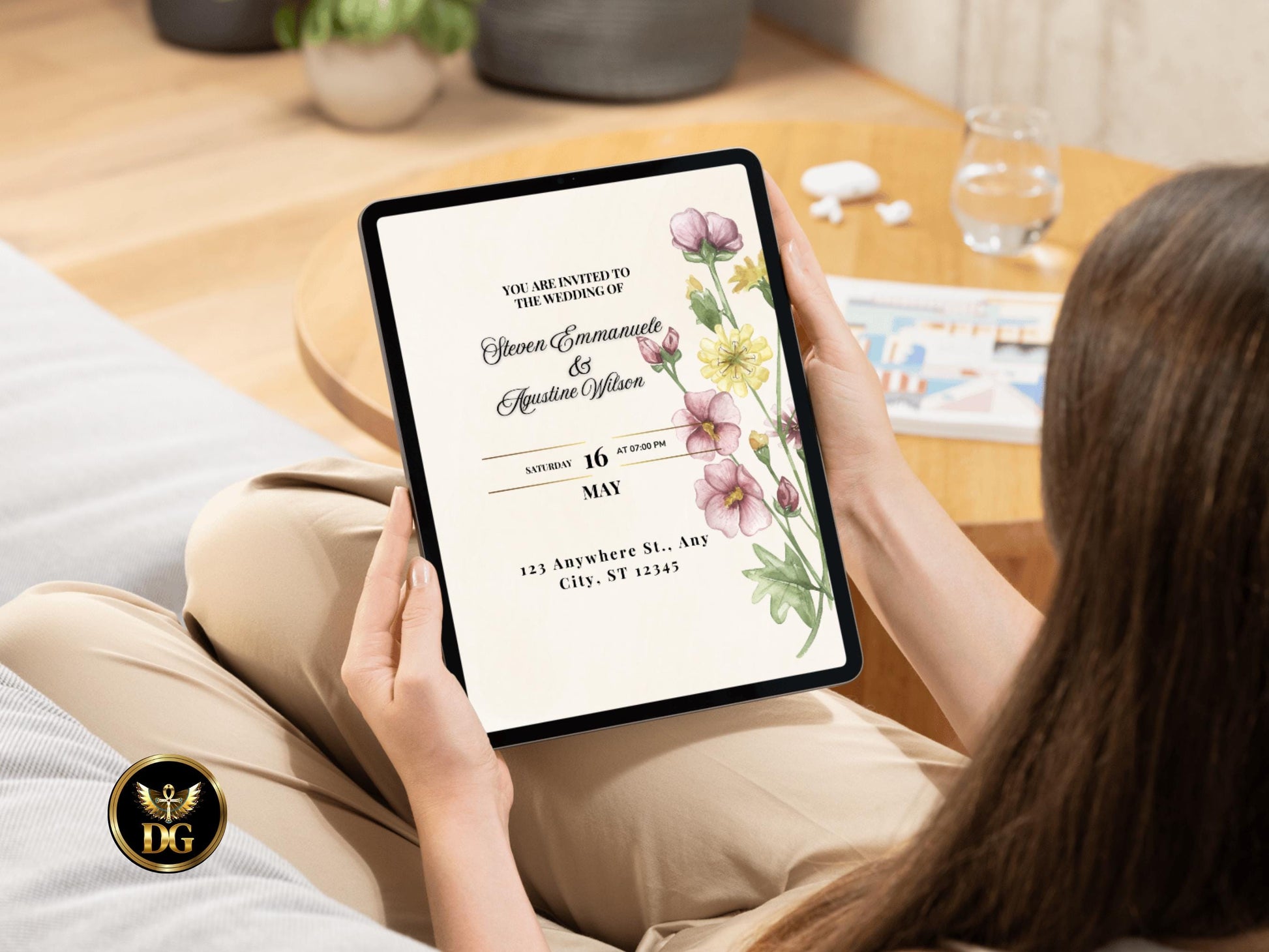 Fully Customizable: Edit text like names (e.g., Steven & Augustine Wilson), date (May 16, 2025, 7:00 PM), location (123 Anywhere St, Any City, ST 12345), and more. Adjust colors or remove the DG logo.