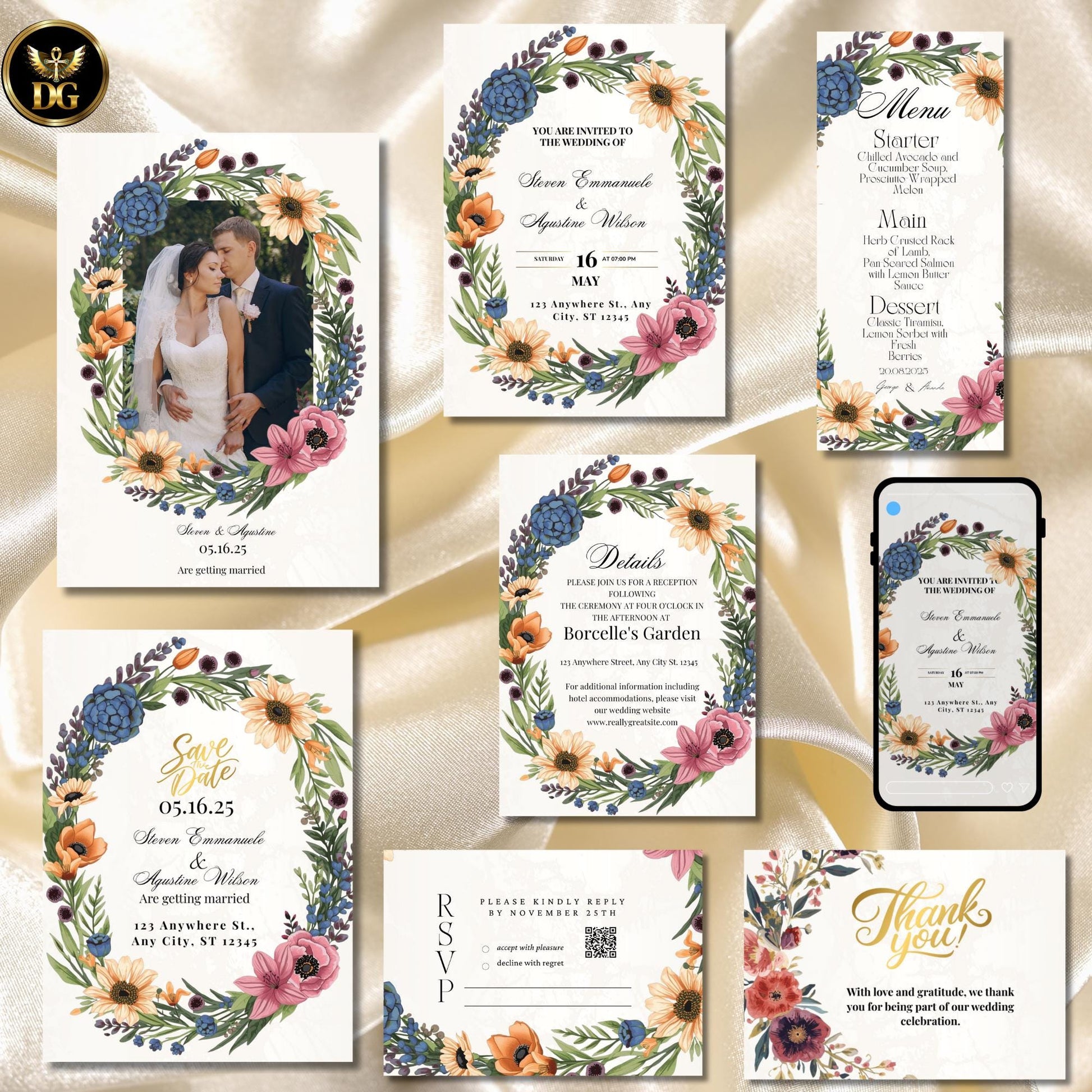 Floral Wreath Wedding Invitation Bundle | Elegant Botanical Canva Templates