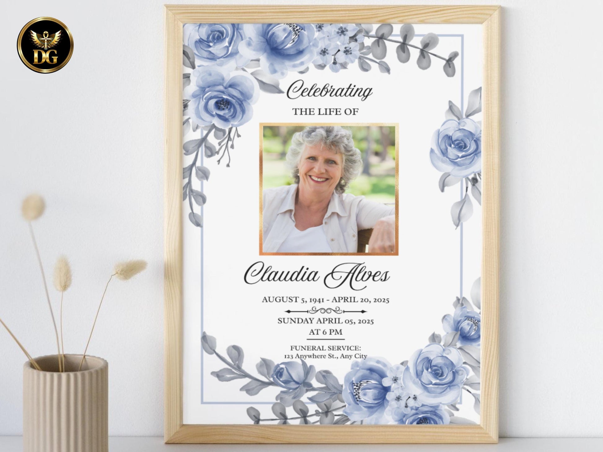 Funeral Invitation & Program Template | Soft Blue Floral Frame | Printable Digital Memorial Set | Editable Canva
