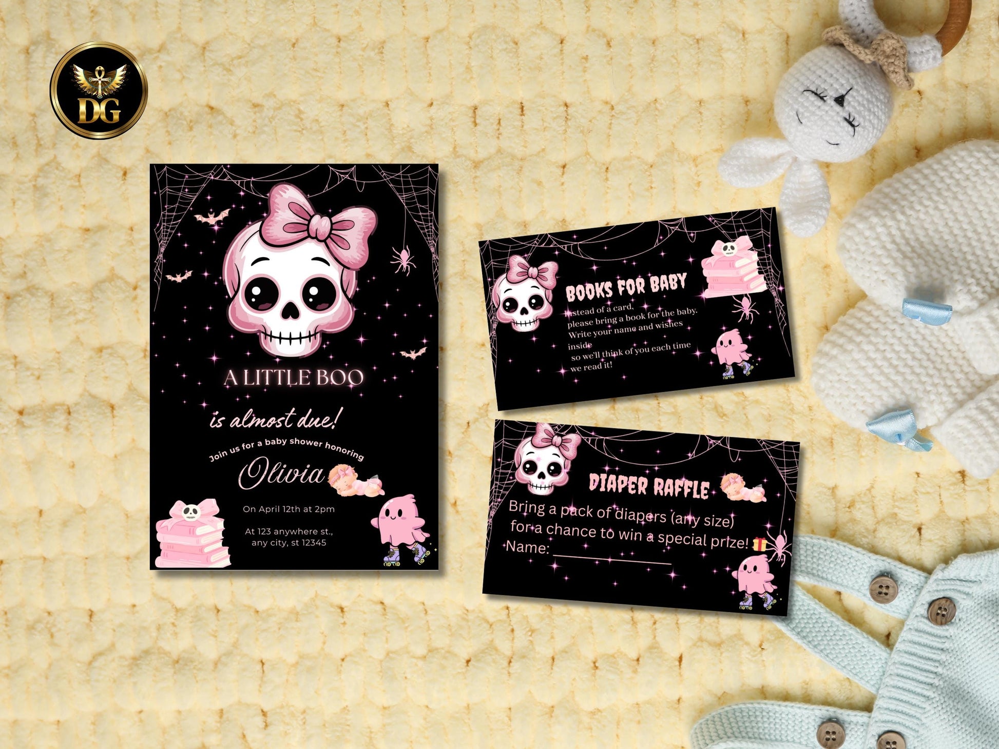 Halloween Baby Shower Invitation Set - Little Boo Pink Skull Girl Theme Printable, Diaper Raffle & Books for Baby Cards, Instant Download