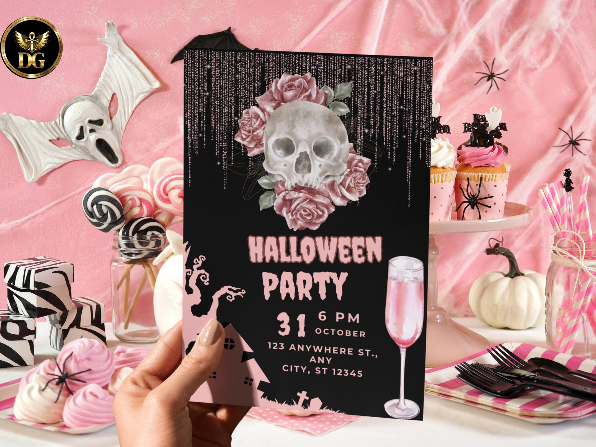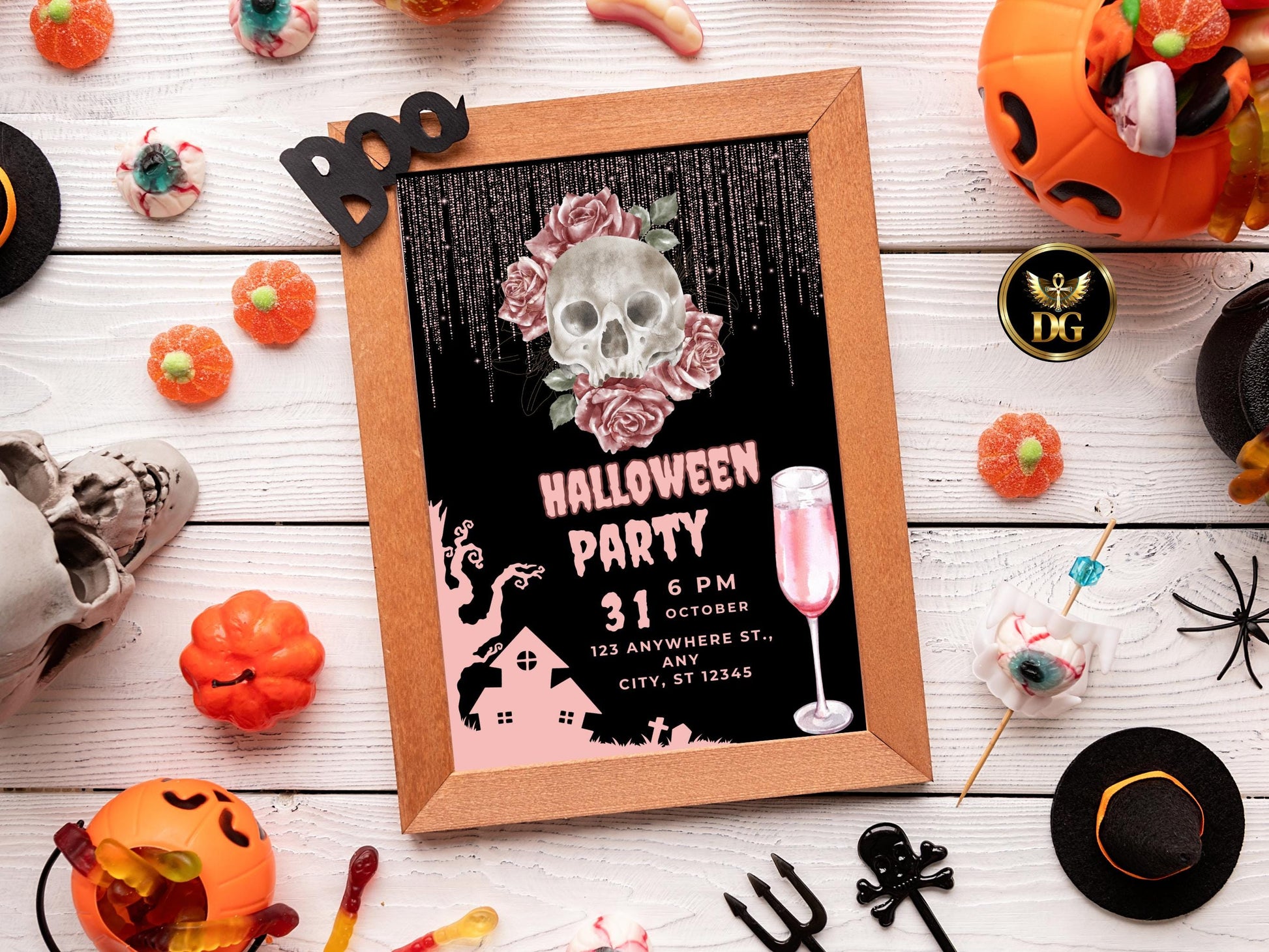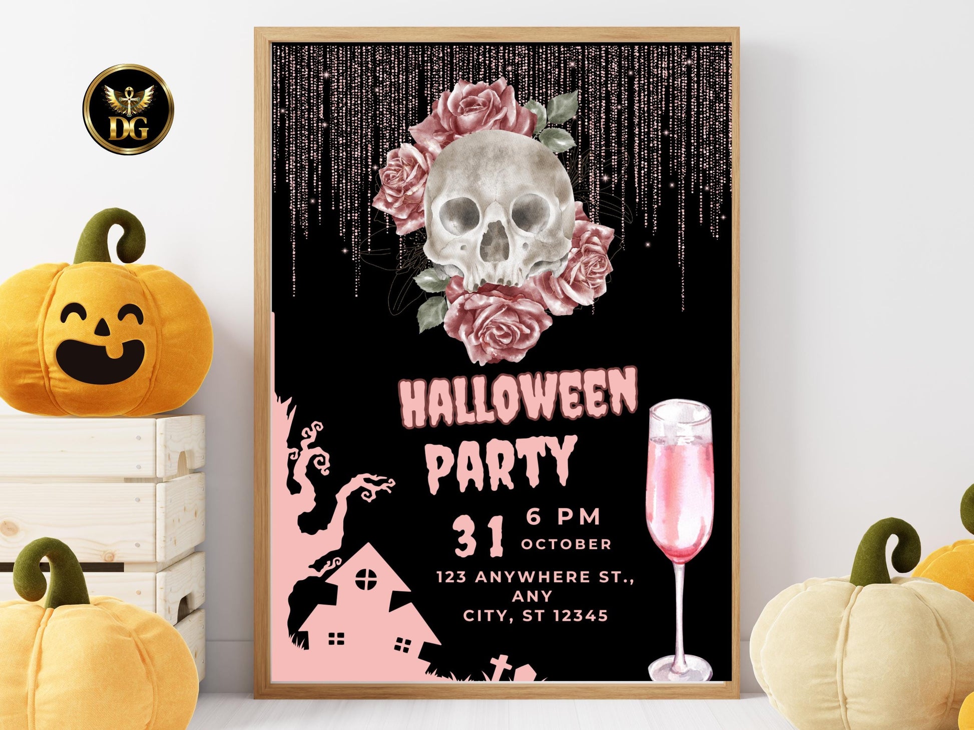 Halloween Party Invitation Pink Skull Gothic Glam Halloween Invite Glitter Glass Printable Invitation Template Editable Instant Download