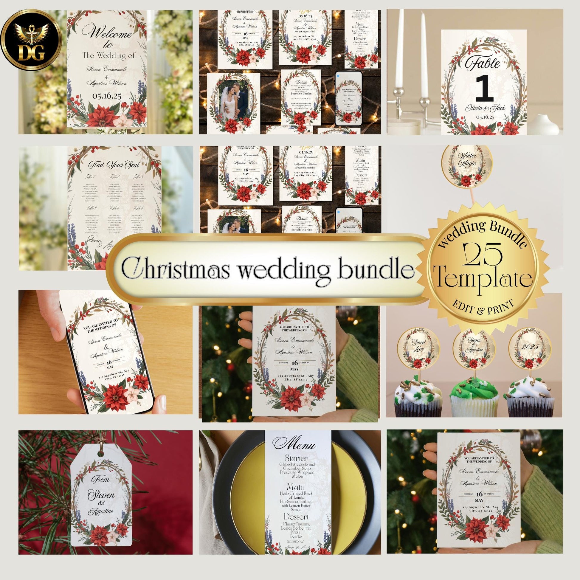 A complete suite of 25 customizable wedding templates. Features a elegant cream & gold background with a romantic Christmas wreath. Includes invitations, menus, seating charts, and more for a cohesive celebration.