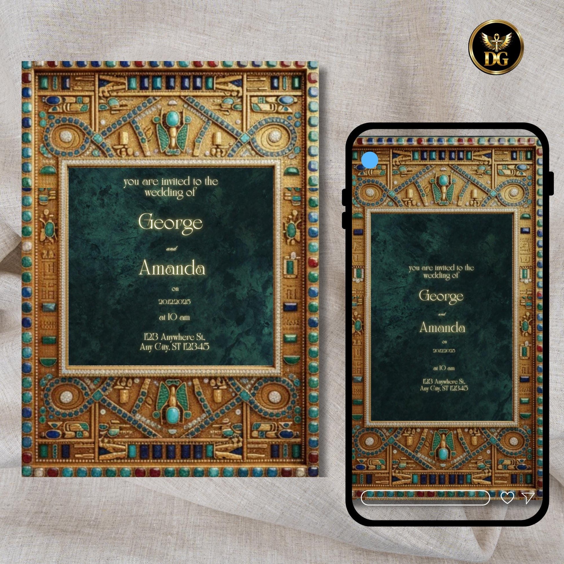 Luxury Egyptian Digital Wedding Invitation - Pharaoh Frame with Emerald Velvet & Jewel Accents