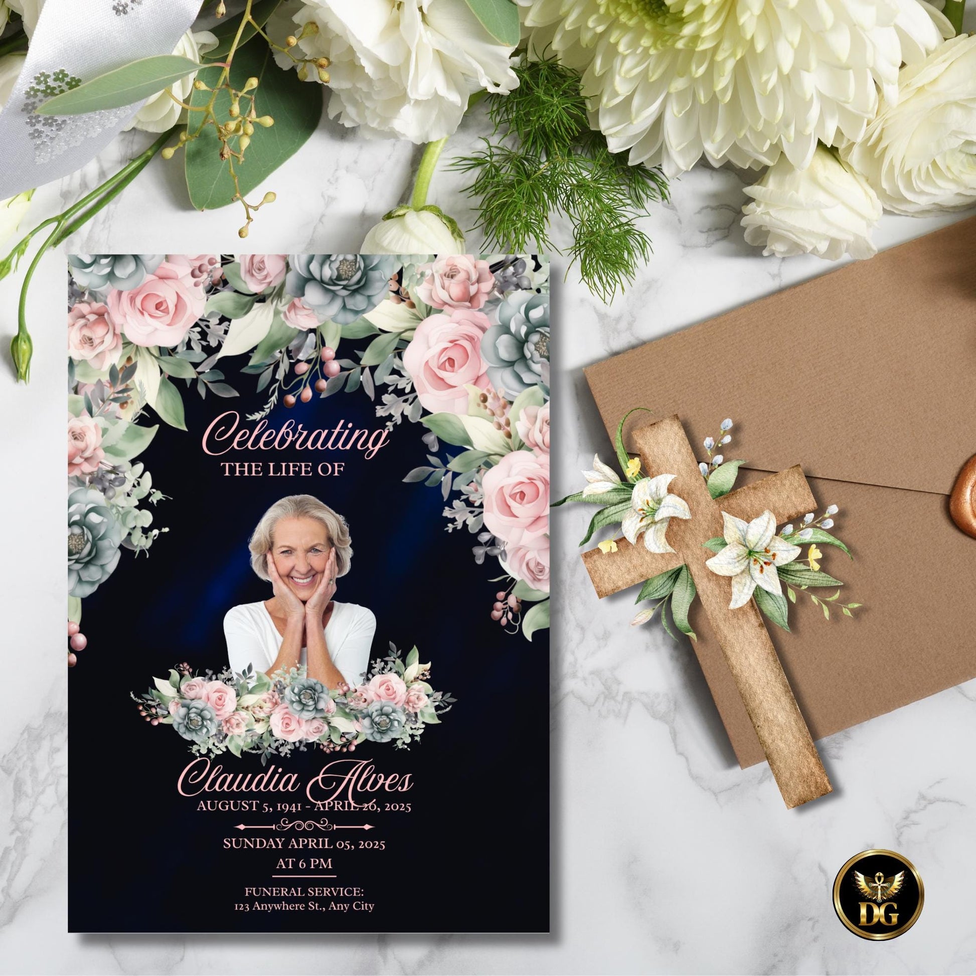 The deep navy background gives a sense of dignity, while the delicate flowers add a touch of warmth and compassion.