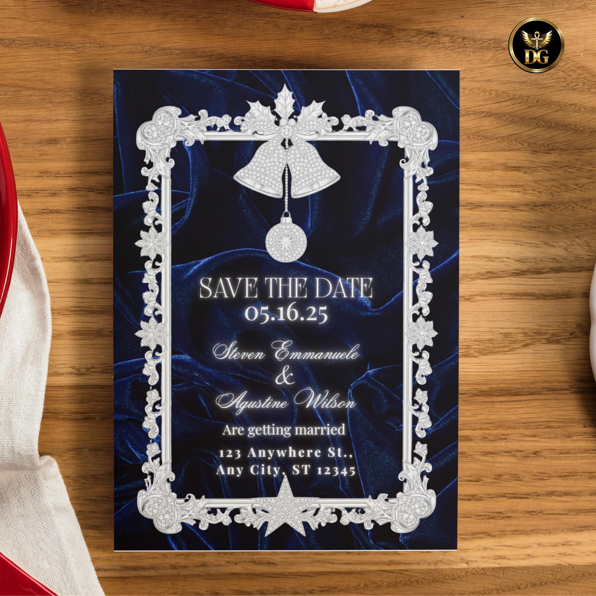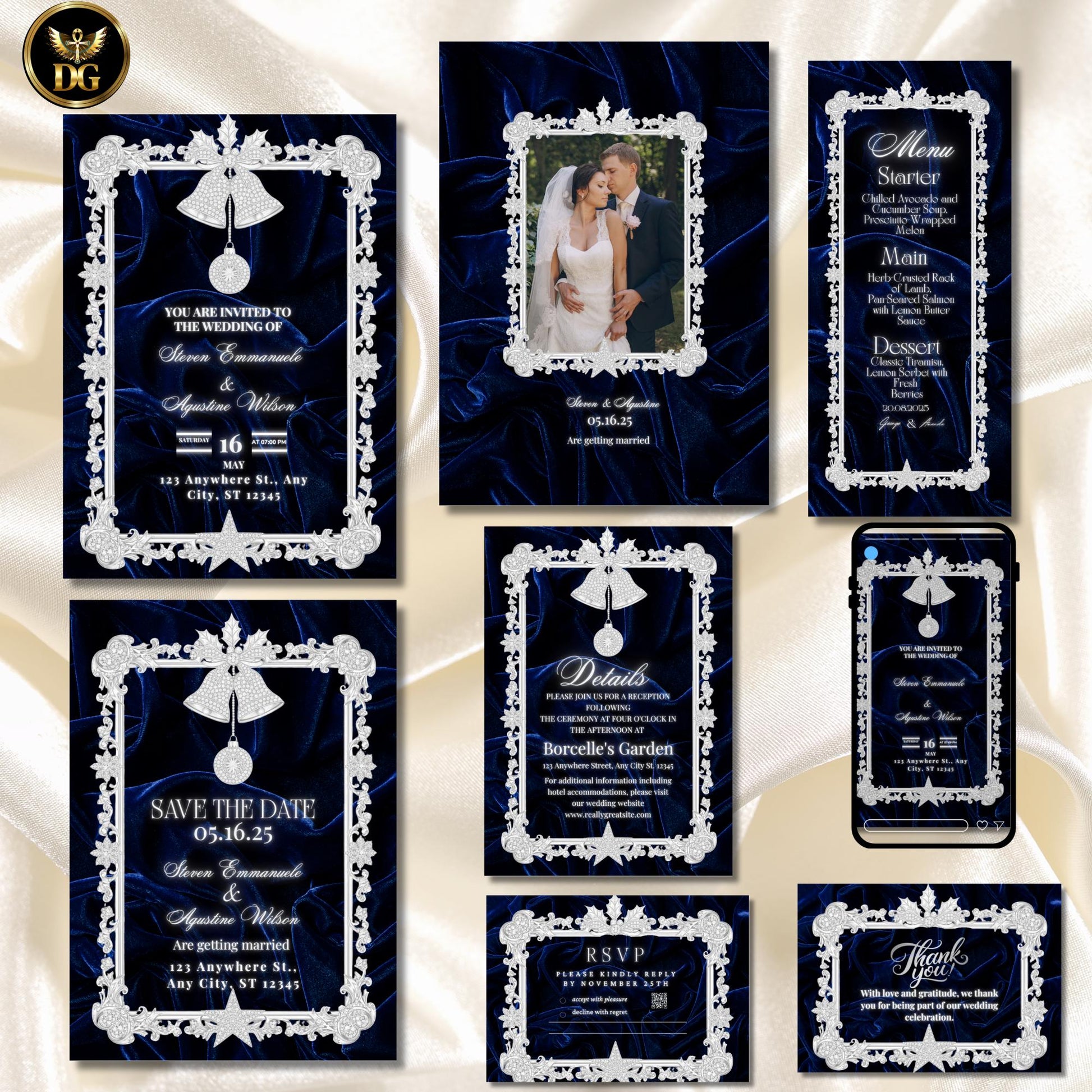 Featuring a deep navy blue velvet background framed with white gold and diamond accents, now reimagined with jingle bells, mistletoe, holly berries, and twinkling Christmas ornaments β this suite embodies timeless glamour with seasonal sparkle β perfect for parties that glow with class and refined holiday luxury.