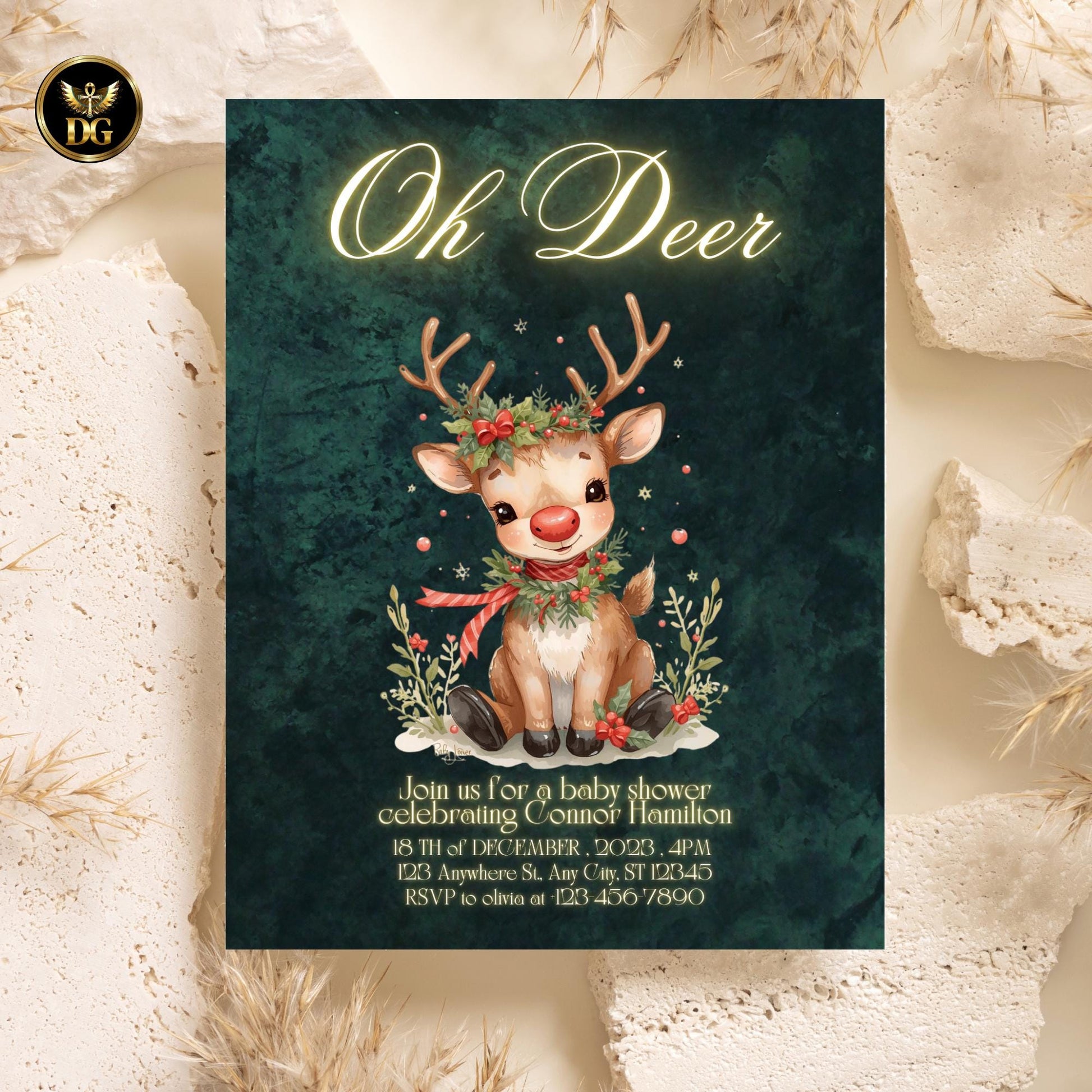 Oh Deer! Christmas Baby Shower Invitation, Emerald Green Velvet Reindeer Holiday Invite, Digital 1080x1920 & Printable 5x7 Template
