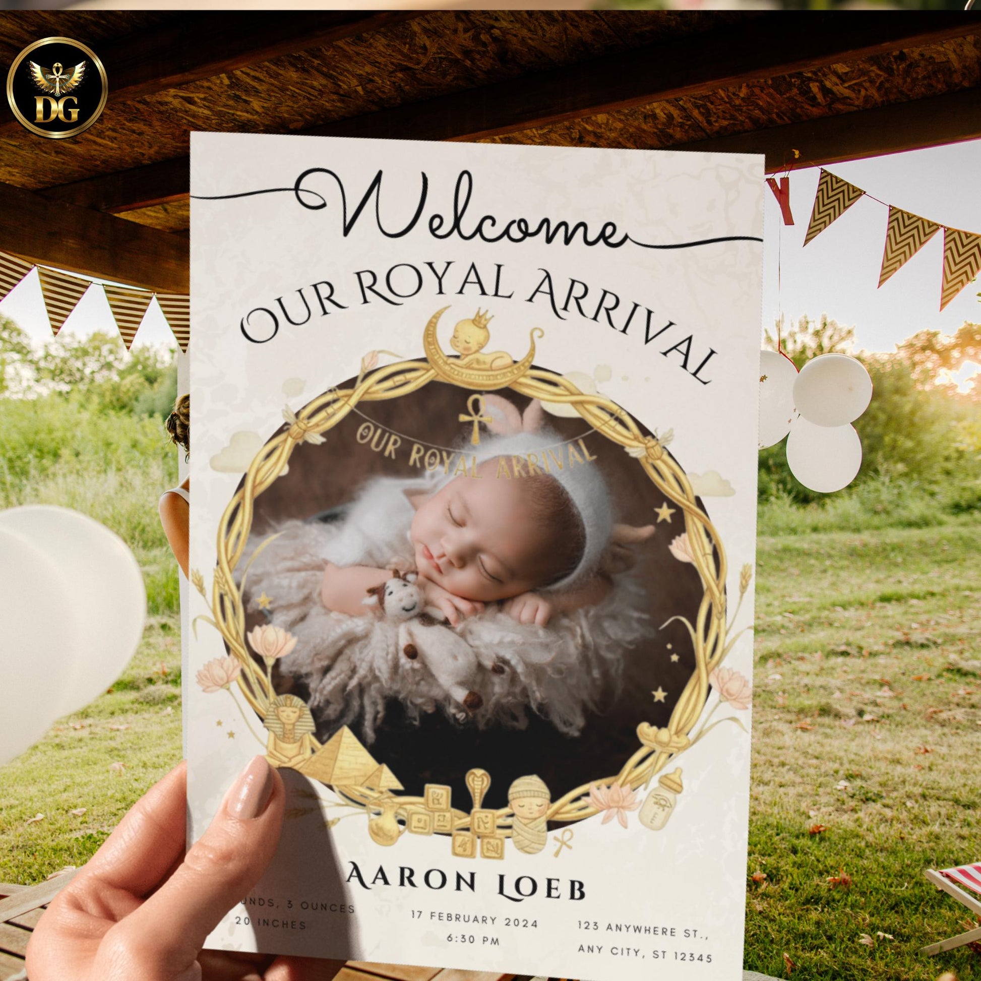 A golden circular Pharaoh-inspired frame holds your newborn’s photo beautifully, with the phrase “Our Royal Arrival” elegantly displayed above.