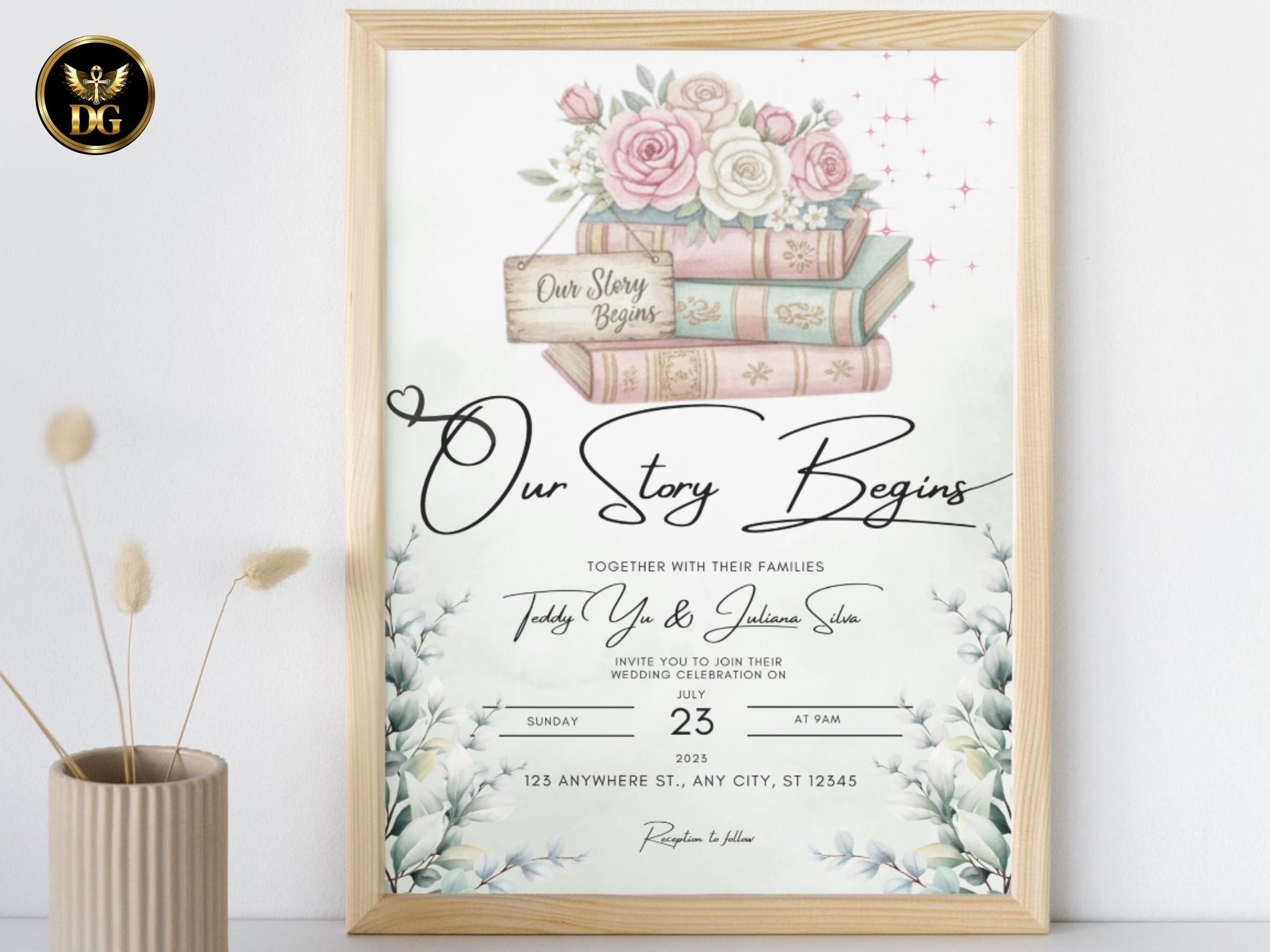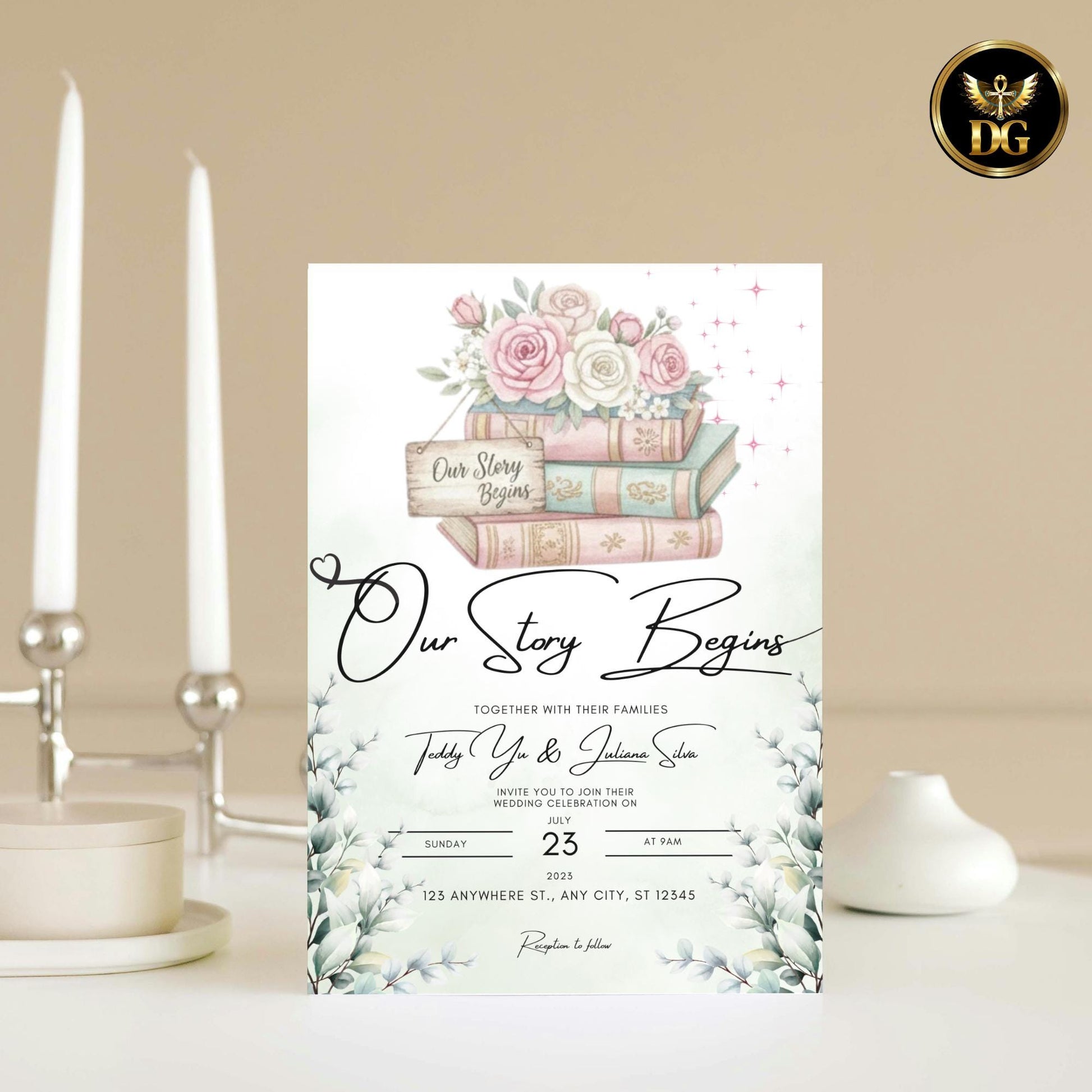 Main Wedding Invitation: 5x7 inches, Digital size 1080x1920px – Features the fixed design with the phrase "Our Story Begins," watercolor leaves, books, and pink roses. You add your personal details (names, date, venue, etc.).