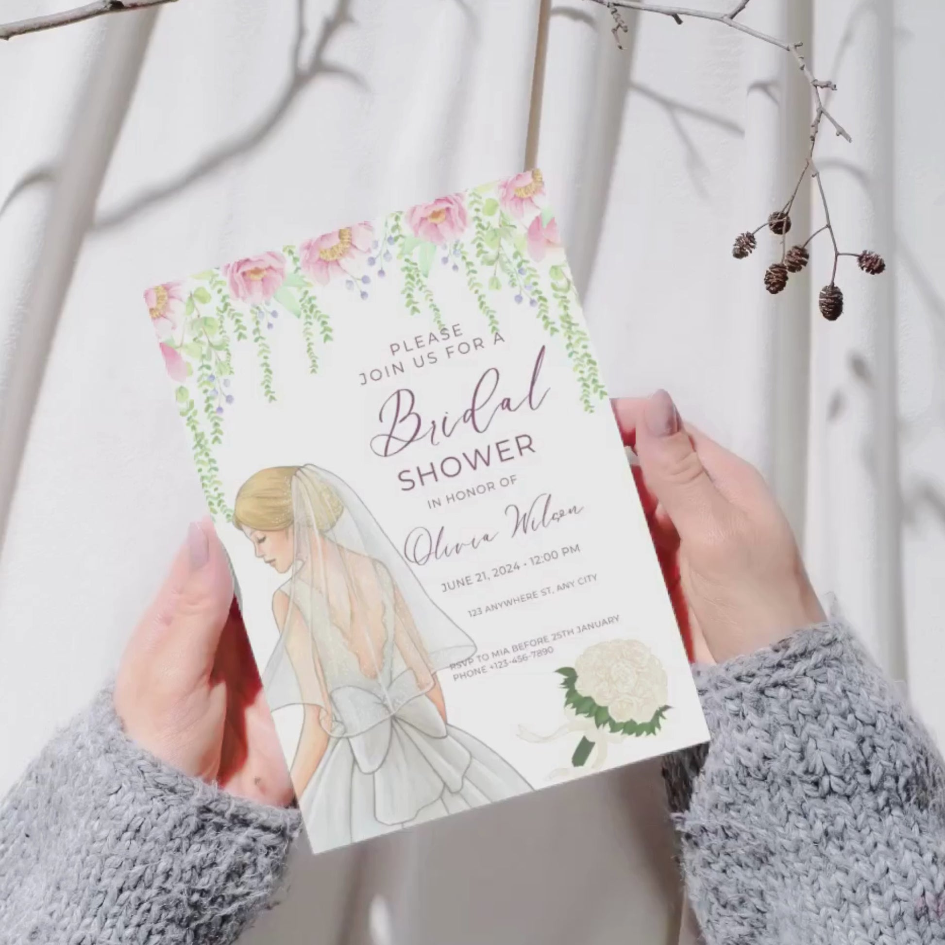 Pink Watercolor Bridal Shower Invitation Template, White Background, Floral Arch with Hanging Branches, Watercolor Bride, Editable Canva