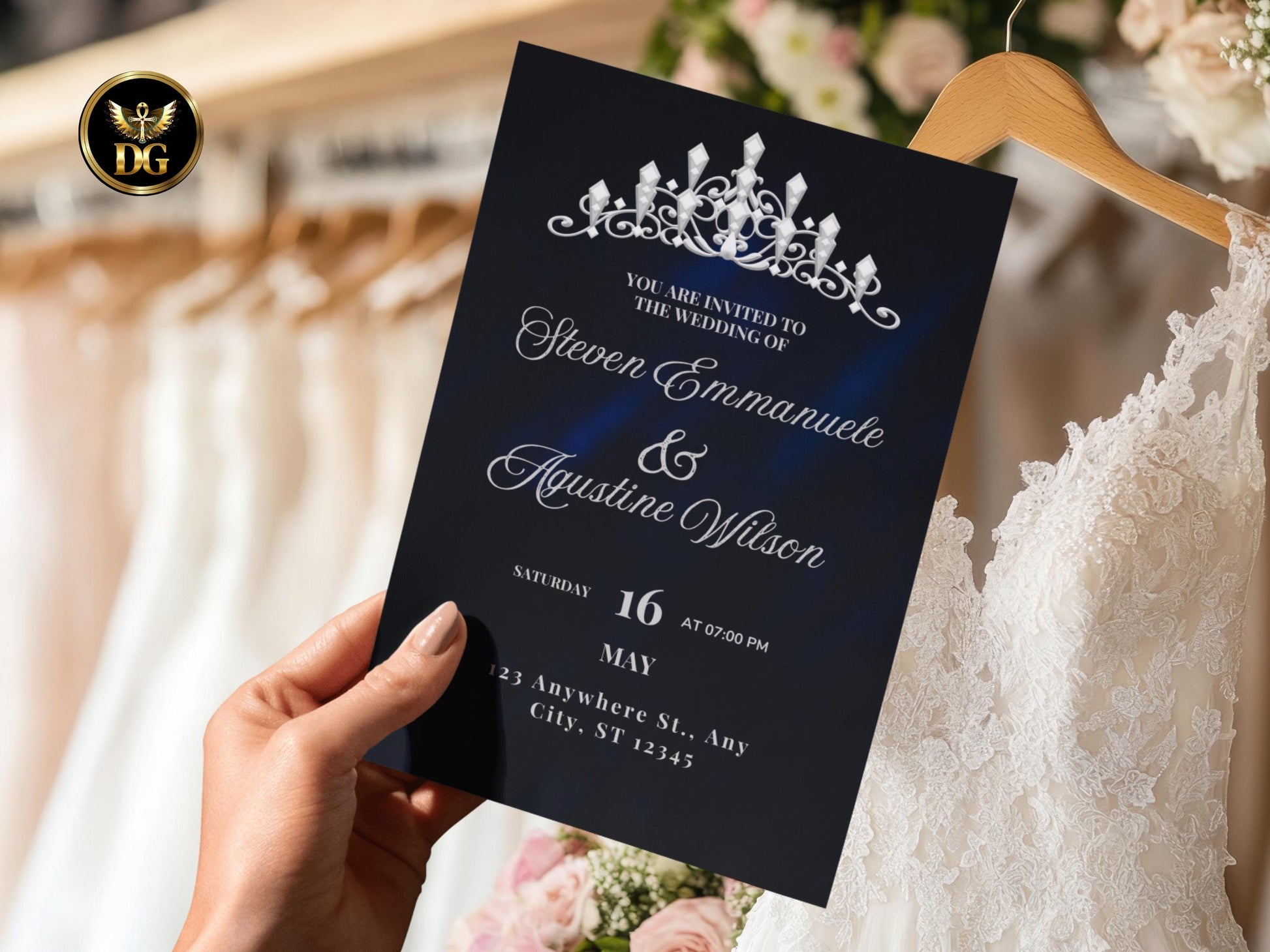 Royal Blue Velvet Wedding Invitation Set: Silver Crown (Digital Download) Printable Invitation Template Editable Canva Instant Download