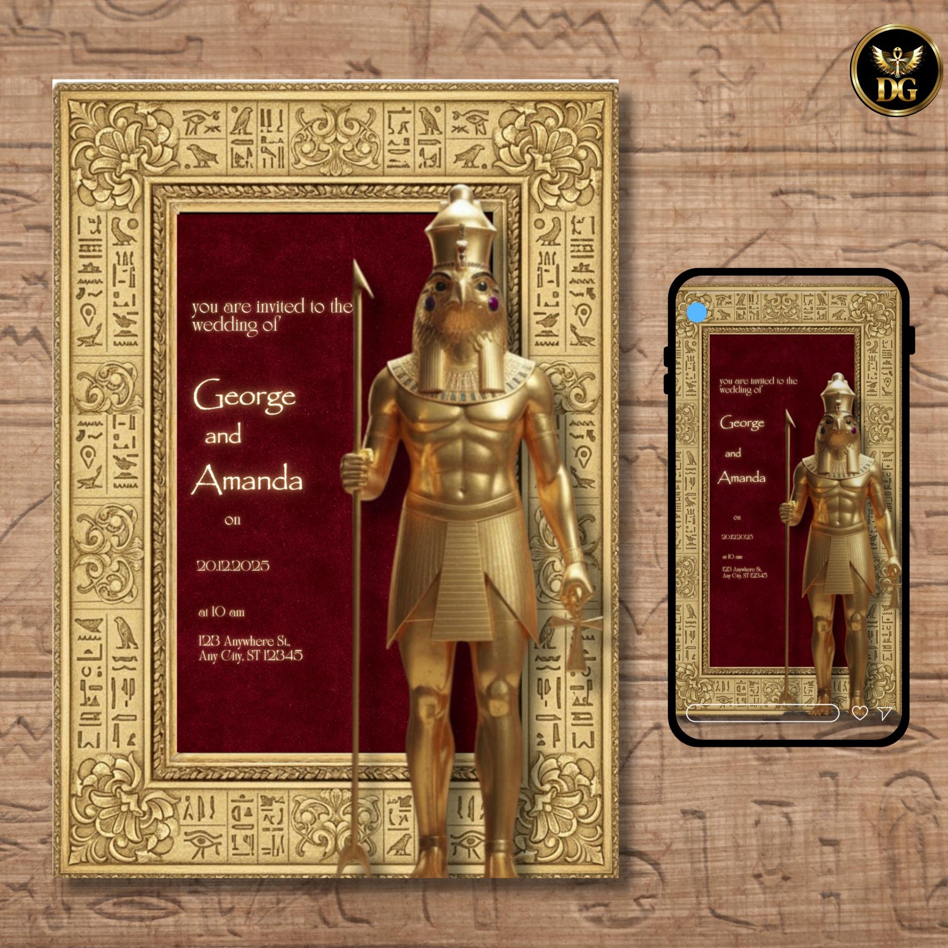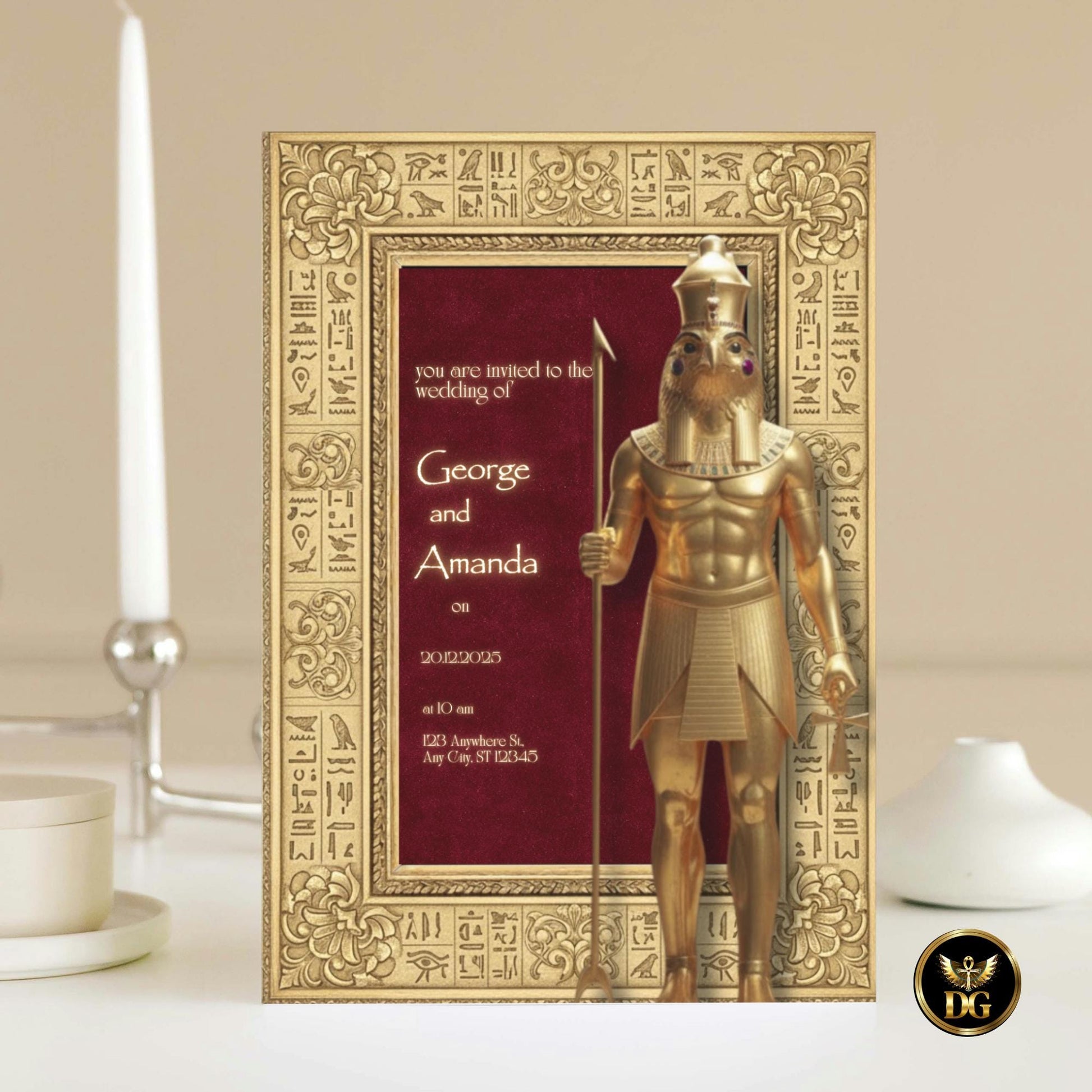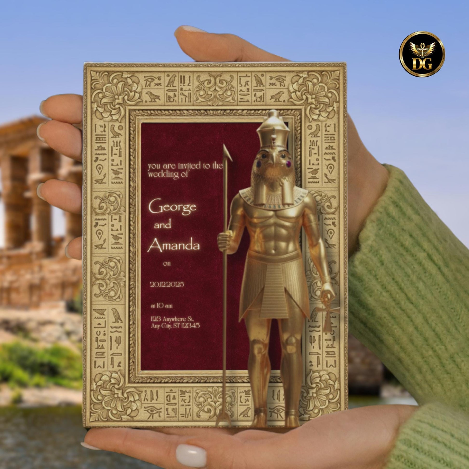 Guardian of the Union: A majestic golden statue of Horus, the god of the sky and protection, stands watch over your invitation—ensuring your marriage is blessed, sacred, and guarded against all evil.