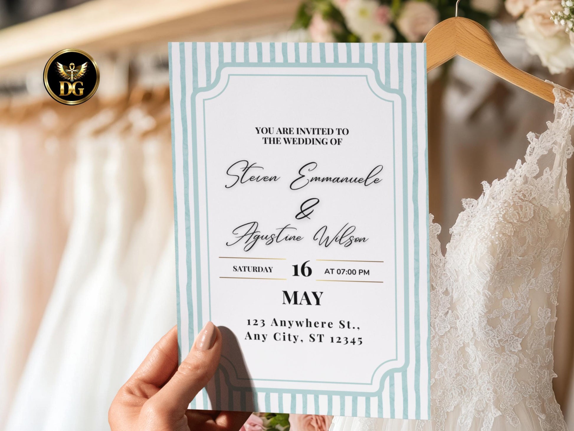 Featuring a soft striped green background with an elegant green frame and clean white space, this design is fresh, modern, and timeless. Perfect for couples who love a simple yet classy style for their big day.