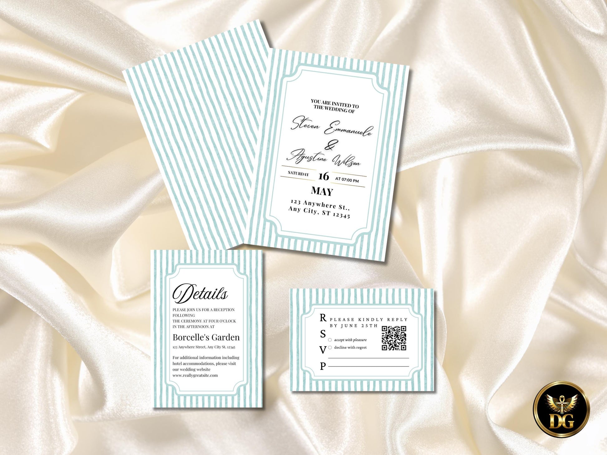 Striped Green Wedding Invitation | Light Green Elegant Wedding Suite | Editable Invitation, Details & RSVP