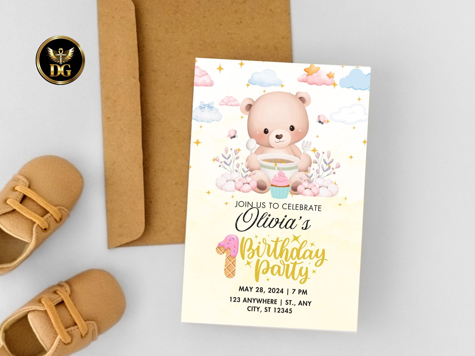 Teddy Bear Birthday Invitation: Pastel Stars, Whimsical First Birthday (Digital Download)