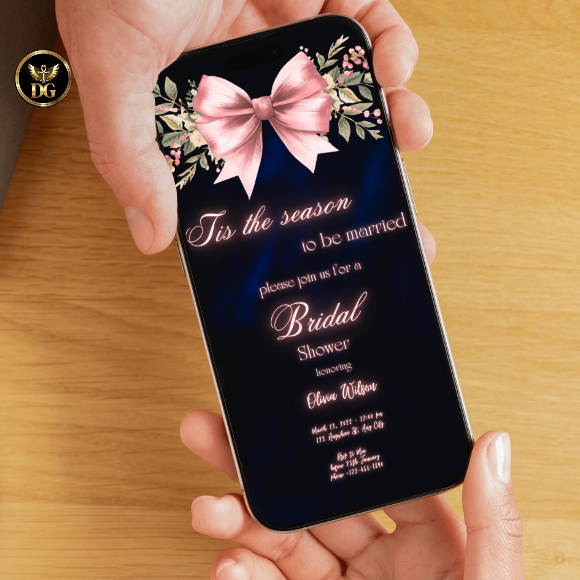 Tis The Season to Be Married Bridal Shower Invite - Navy Velvet, Pink Bow & Roses, Canva Editable, 7x5 Print, 1080x1920 Digital