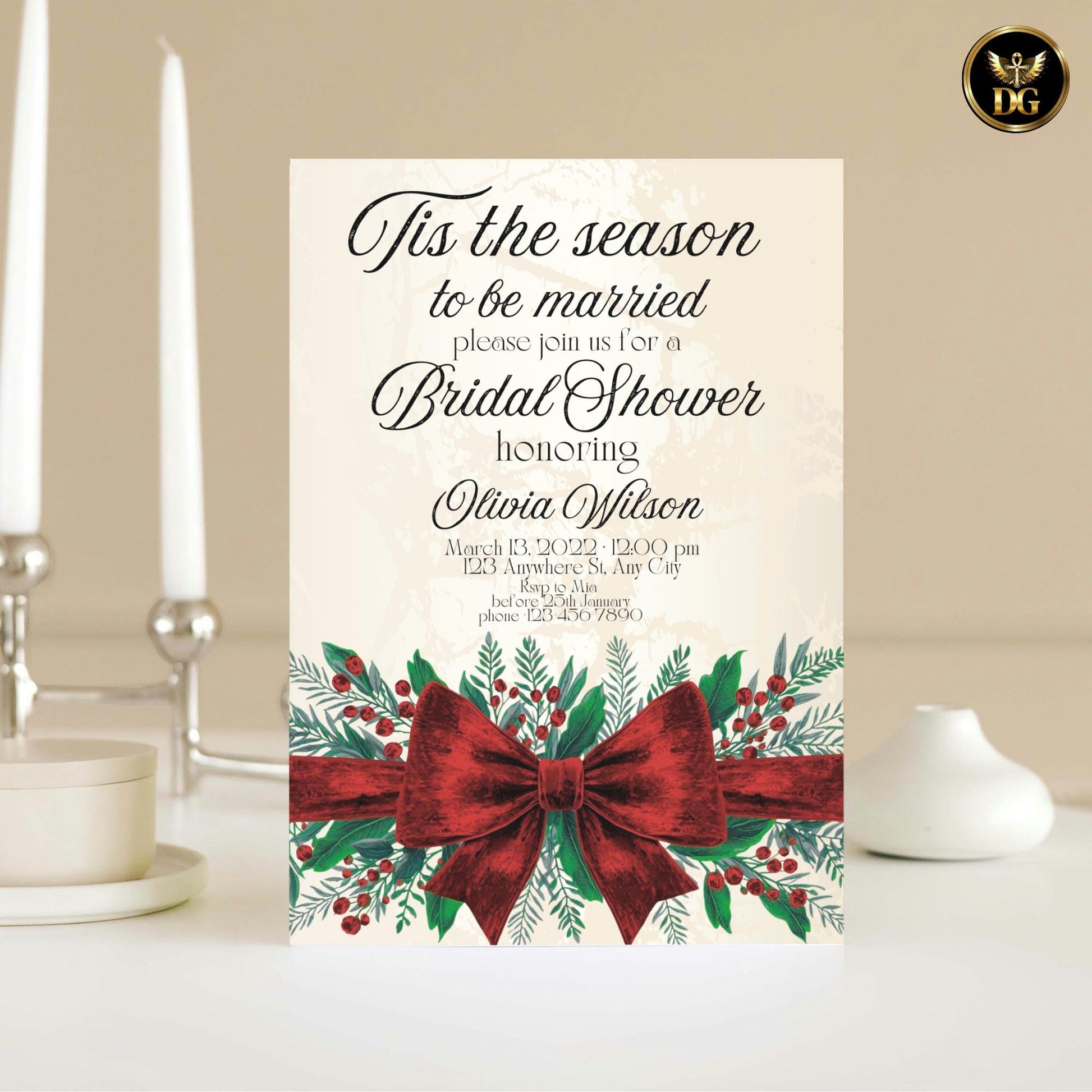 Tis The Season to Be Married Christmas Bridal Shower Bundle Luxe Velvet Red Bow, Evergreen Berries, Cream Gold, Canva Editable